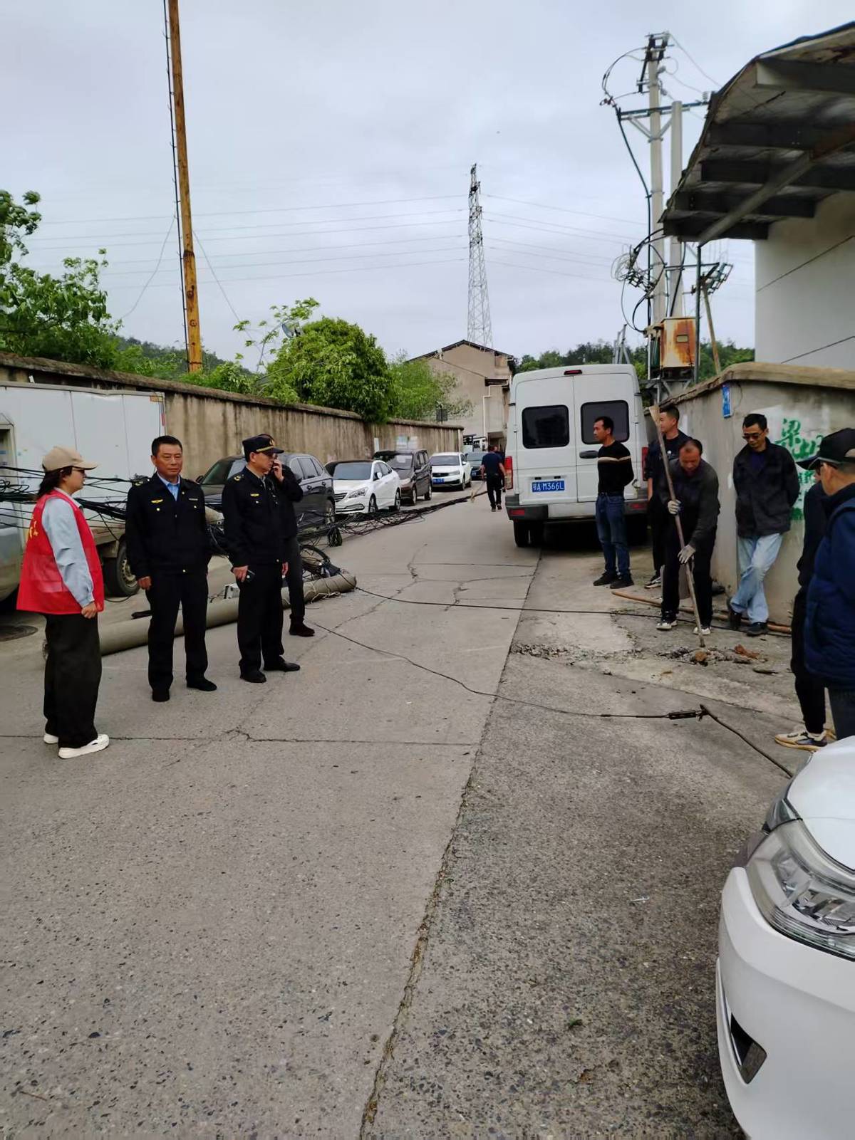 现场抢险过程中纸坊街道站西社区、纸坊街道综合执法中心协调各部门形成工作合力,交警部门负责实施临时交通管制与疏导,维护现场秩序;社区工作人员和执法人员配合进行周边警戒与群众解释工作;各通信运营企业则迅速调集抢修队伍与设备,对倒伏的线杆及线路进行专业排查、切割与扶正,全力开展抢修恢复工作。