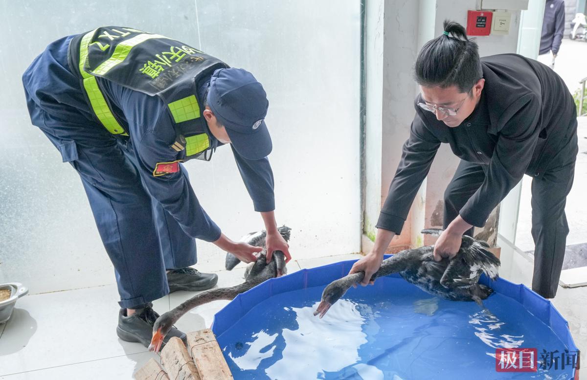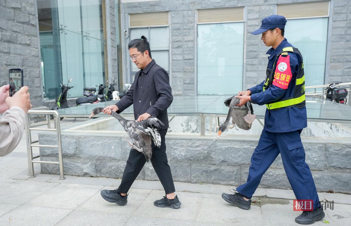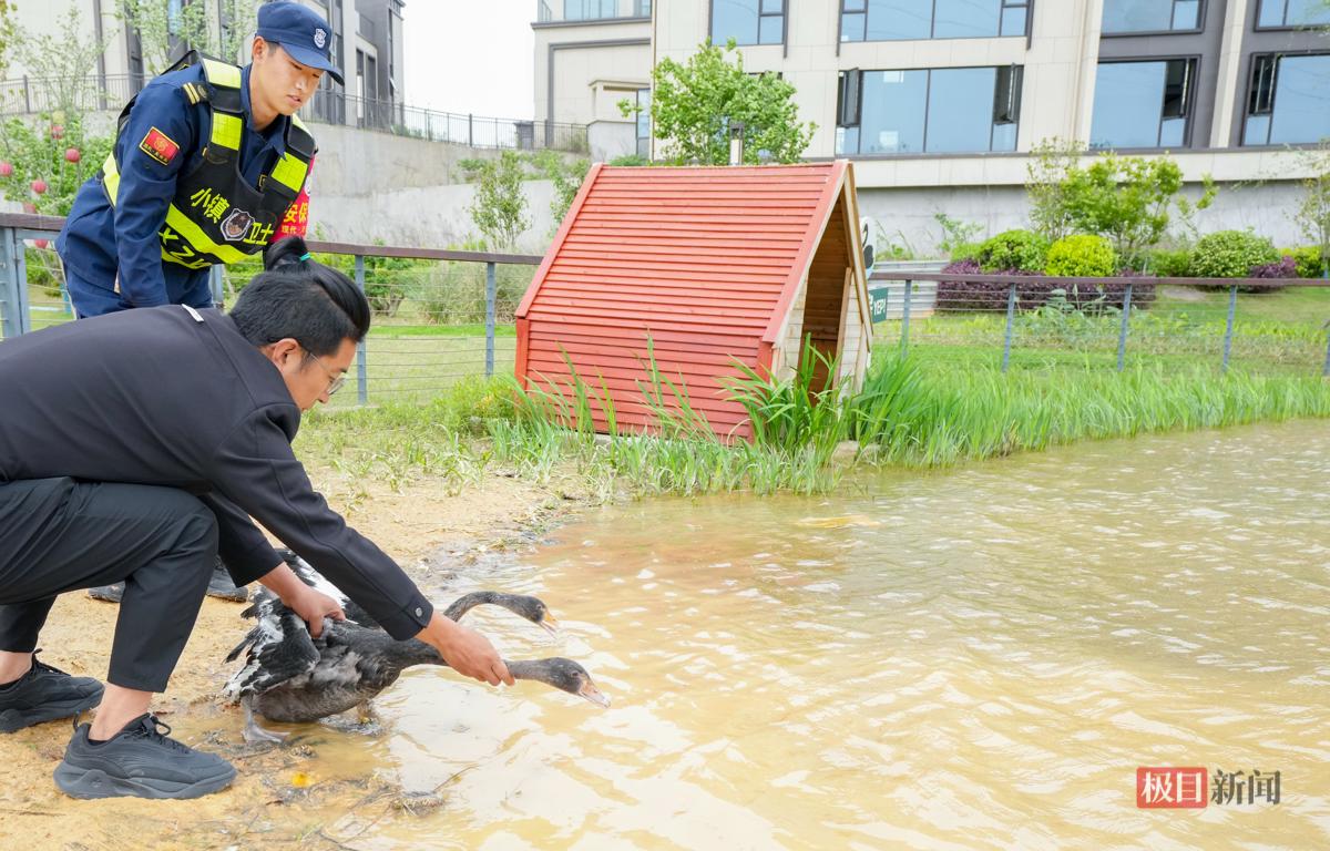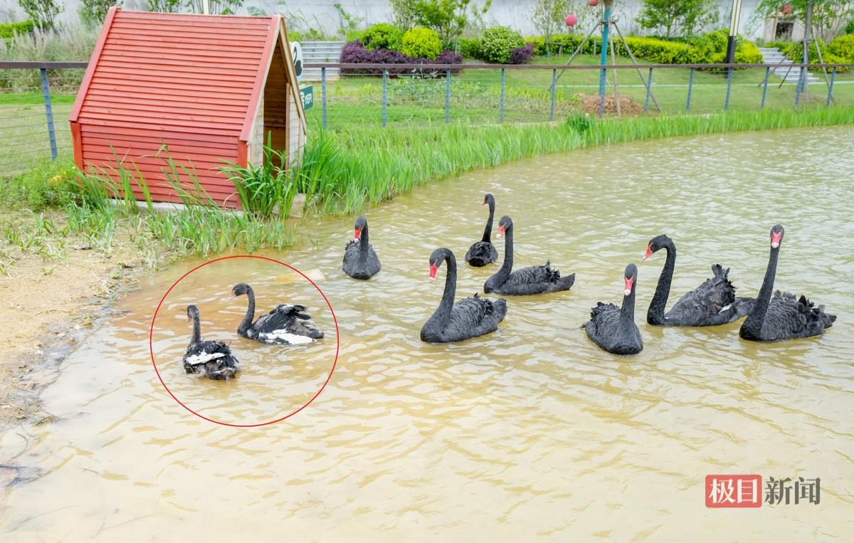 当天上午,小镇工作人员将小天鹅从恒温室带出。两个小家伙刚一下水,鹅群便迅速围拢过来,仿佛都在欢迎新来的小成员。工作人员还往湖面投撒了菜叶等食物。远远望去,小天鹅在湖面上悠闲戏水,天鹅妈妈紧随其后,一路守护,生怕孩子受半点欺负。