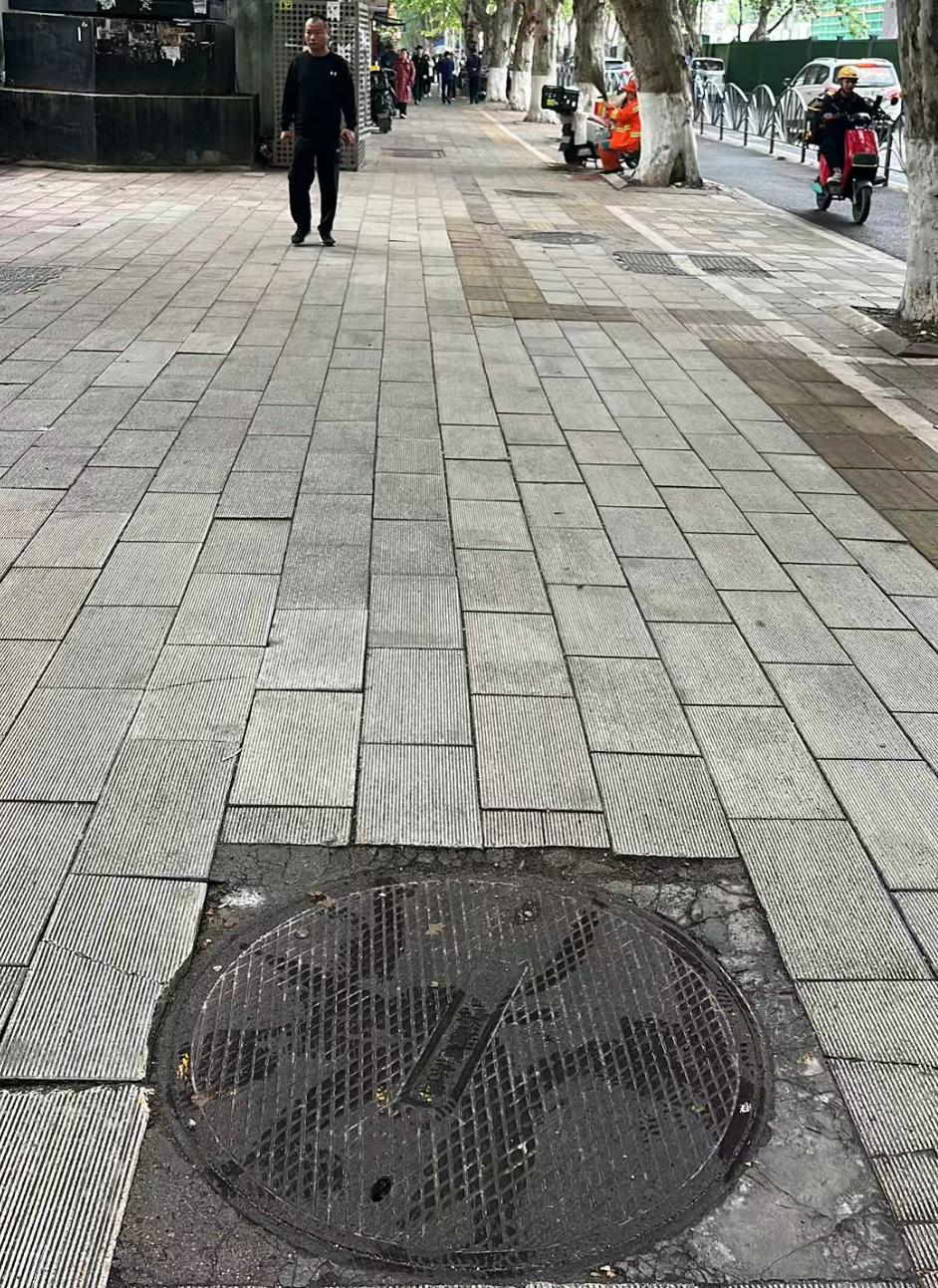 “就是这枚井盖,比周边的都大一圈,一眼就能注意到。”4月16日,新闻记者和葛先生来到汉口万松园路一家商店门口的人行道上,找到了这处井盖。