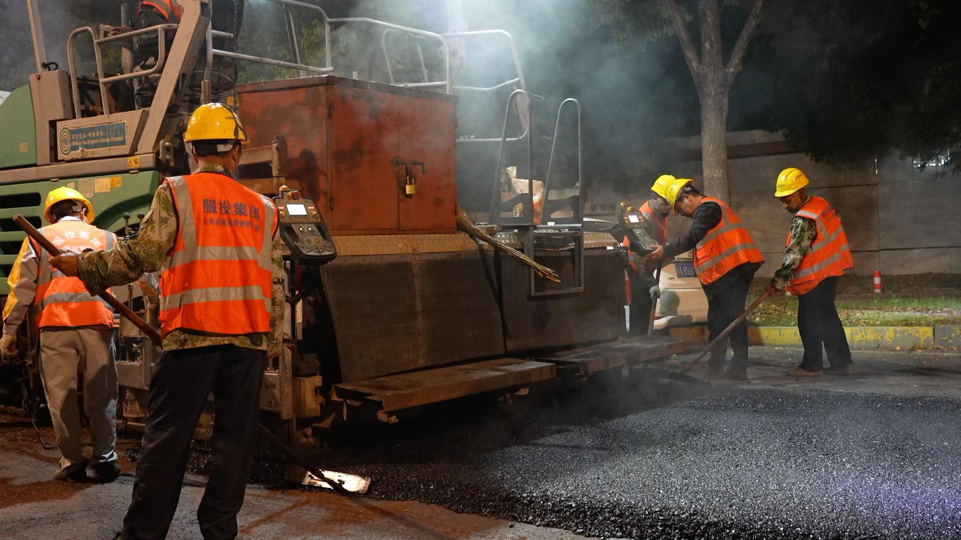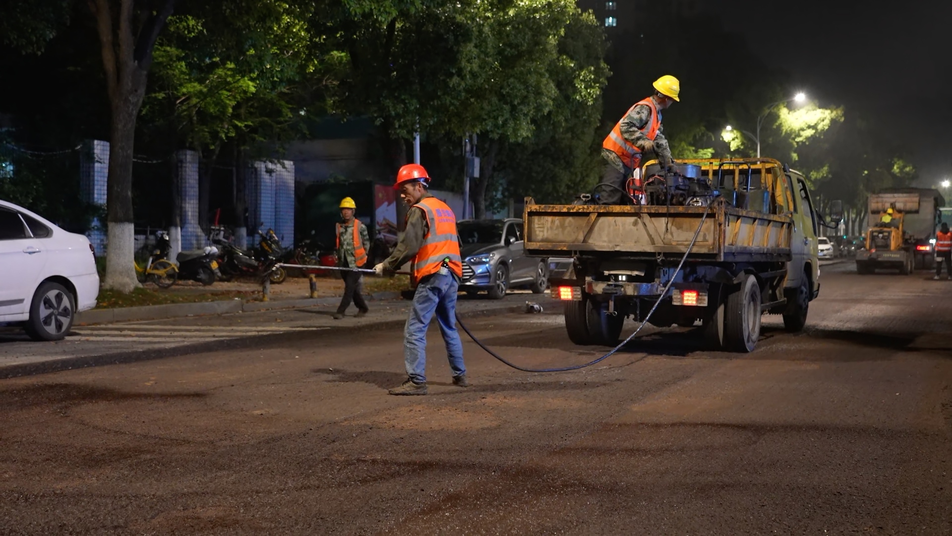 当晚10时,16名施工人员迅速进场,分成4个班组同步作业。大型铣刨机将破损路面逐层清除,压路机紧随其后反复碾压新铺的沥青。考虑到这条路长期有重型货车通行,施工方采用了“双层沥青”结构:下层铺8厘米厚的粗粒式沥青混凝土,提供稳固的承重基础;上层再覆盖4厘米厚的细粒式沥青混凝土,既能降低行车噪声,又耐重压、抗车辙。东西湖区服投公司项目经理冷程才介绍说:“这种结构上下咬合紧实,路修好后,至少五年内不用大修!”