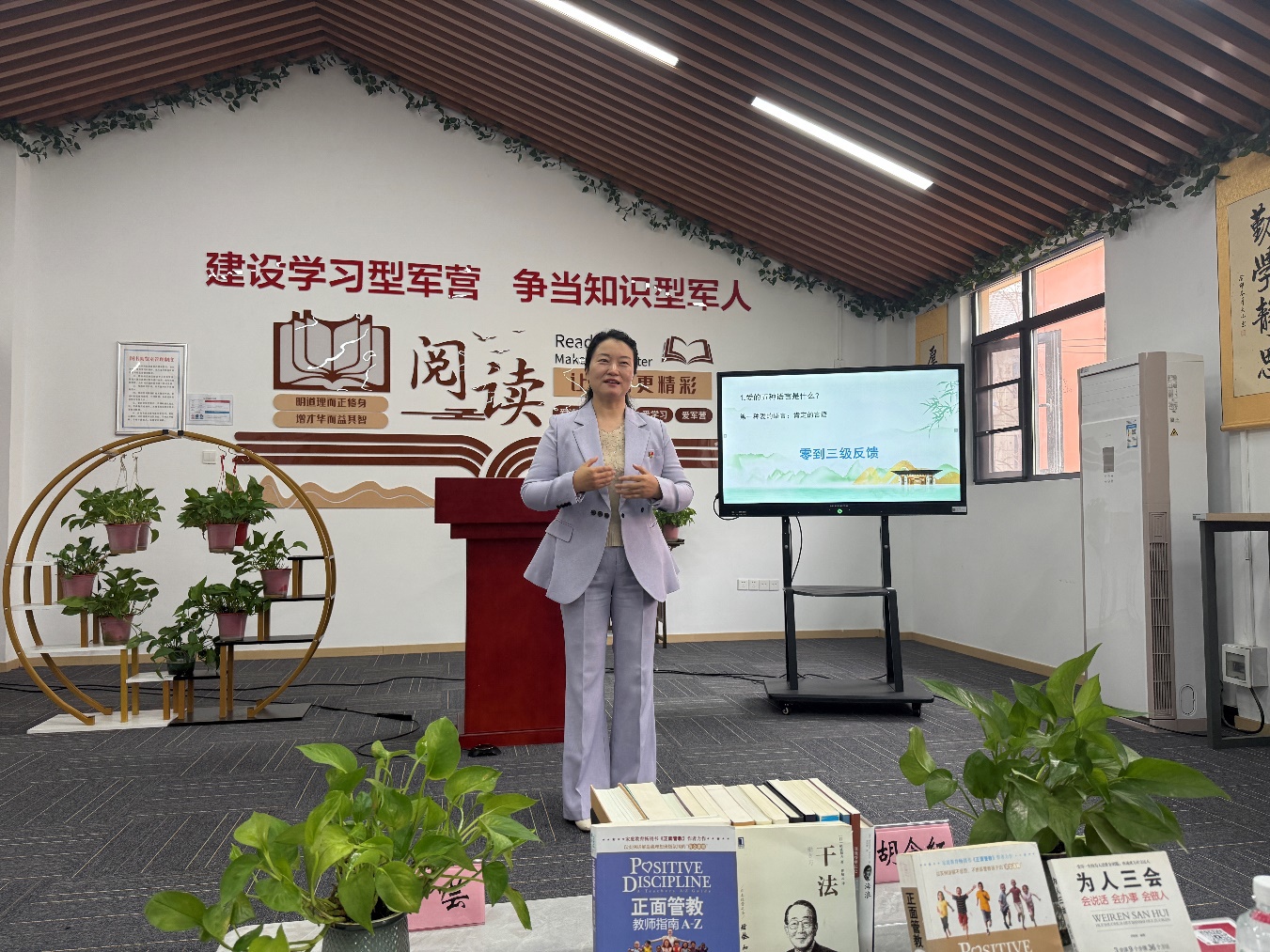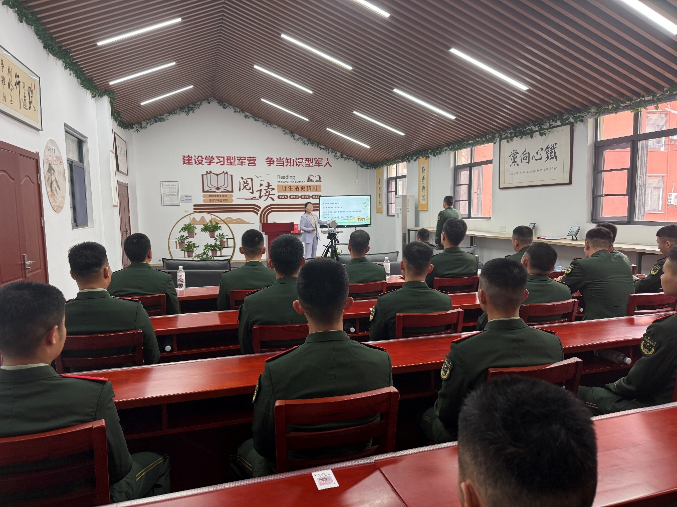 本次活动特邀国际正面管教讲师、“武汉最美阅读人”、高级家庭教育指导师胡念红主讲。胡念红深耕家庭教育、情感沟通与阅读推广领域,此次结合军人职业特殊性与家庭生活实际,围绕《爱的五种语言》一书核心内容,用通俗易懂的语言、贴近军营的鲜活案例,为官兵细致讲解情感沟通、家庭相处、亲密关系维护的实用方法与技巧,帮助官兵掌握情感表达艺术、化解家庭相处难题