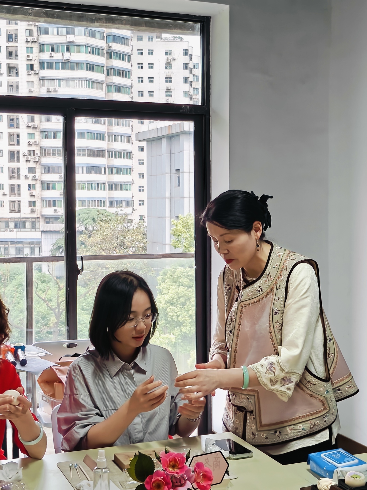 在手作体验环节,参与者们热情高涨,纷纷动手尝试制作茶果子。杨玉菲老师穿梭在人群中,一对一提供协助指导,及时解答大家在制作过程中遇到的难题,从面团揉捏的力度到花纹勾勒的细节,逐一耐心纠正,全力确保每位参与者都能顺利完成2款专属茶果子作品。大家在指尖的揉搓与雕琢中,亲身感受非遗技艺的温度,沉浸式体验传统手作的乐趣。