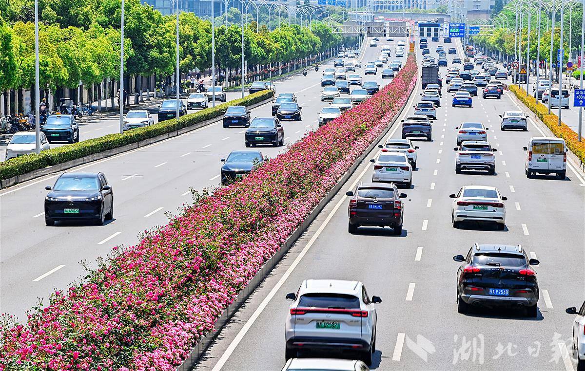 一路繁花背后,是一座城市治理的用心。近年来,在“湿地花城”建设规划的指引下,武汉市、区园林和林业部门按照“一路一策”原则,科学规划、精心培育,大量引进“西子伊人”“约定”等国内自主培育的优良月季品种。这些被市民戏称“开花机器”的月季,花量大、花色艳丽,花期最长可达200天,比传统月季多30天至50天。不仅如此,这些美丽的花朵还很“省心”,能够“残花自洁”,无需园林工人频繁上路修剪,既降低了养护成本,也保障了交通与人员安全。