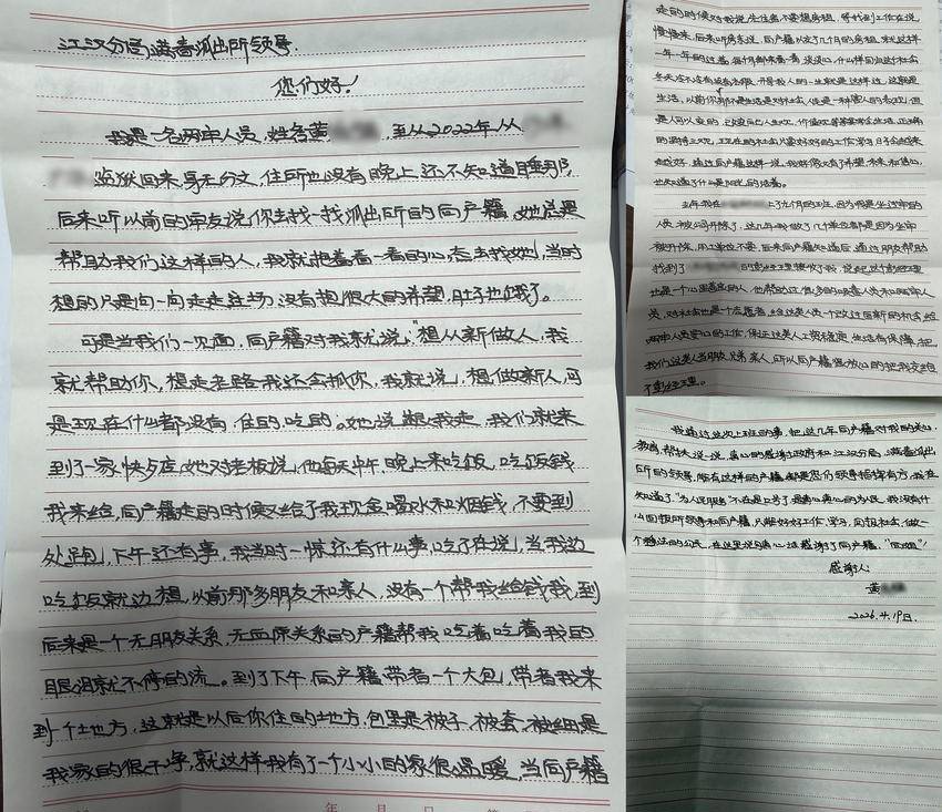 警徽映初心,帮扶暖民心。向警官用数年的坚守告诉我们,人民警察的温度,从不止于打击犯罪的雷霆手段,更藏在为迷途者撑起的屋檐下,藏在一次次耐心的开导里,藏在为他们奔走的每一步路上。这封手写信,不仅是老黄的新生告白,更是对无数像向警官一样的基层民警最诚挚的肯定和礼赞。