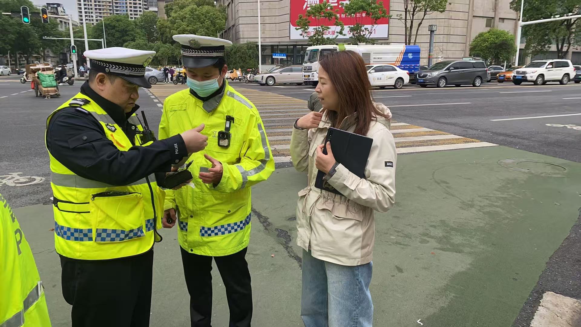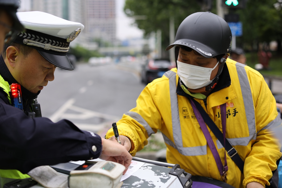 9点10分,解放大道解放公园路口,一辆轻型货车违规驶入禁行区域,被八中队民警游杰清、温磊拦停。驾驶员以“路况不熟、首次来汉”为由请求放行。游杰清与温磊并未简单处罚,而是耐心向二人讲解货车通行管理规定,详细介绍江岸辖区道路分布情况,细致解答驾驶员的各类疑问,引导其规范行驶。处理完货车违规问题后,游杰清又发现一辆电动自行车闯红灯,他结合汽车行驶盲区、闯红灯引发事故的危害等内容,对驾驶人进行警示教育;温磊则递上交通安全宣传单,暖心提醒其为自身和家人安全文明出行。一番情理兼具的劝导,让驾驶人深刻认识到错误,连连为交警的认真负责、热情暖心点赞。
