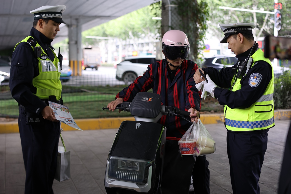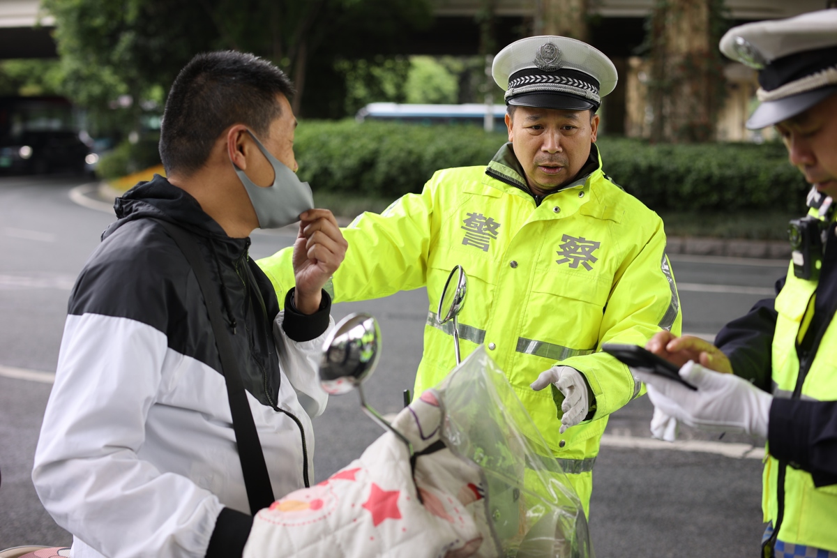 10时30分,建设大道与黄浦大街路口,交通安全宣传氛围浓厚。九中队指导员郭文结合自身工作经历,通过真实案例向过往群众讲解交通违法行为的危害;执勤警力还在路口设置宣传展板,对存在轻微交通违法行为的骑行者开展现场教育,通过赠送文明出行礼袋、组织朗读宣传口号等形式,让交通安全知识深入人心。同时,六中队长陈涛带领民辅警在解放大道与香港路路口,为加装伞篷的电动自行车驾驶员现场拆除违规装备,从源头消除安全隐患。