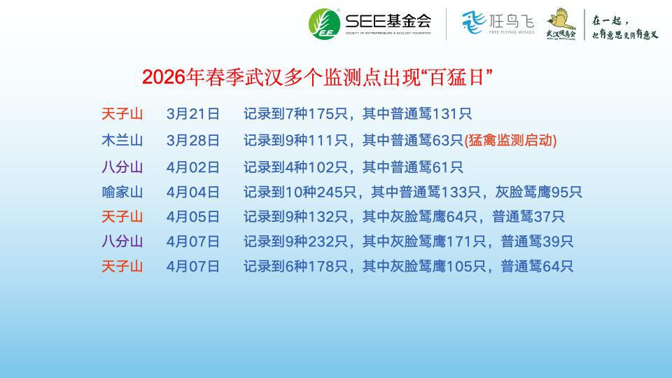 今年的“百猛日”来得格外早。3月21日,志愿者高然等人在天子山监测到迁徙过境武汉的鹰隼类猛禽多达7种,共175只,为今年春迁的第一个百猛日。3月28日,彭憬等人在木兰山记录到猛禽9种,共111只,是春迁的第二个百猛日。