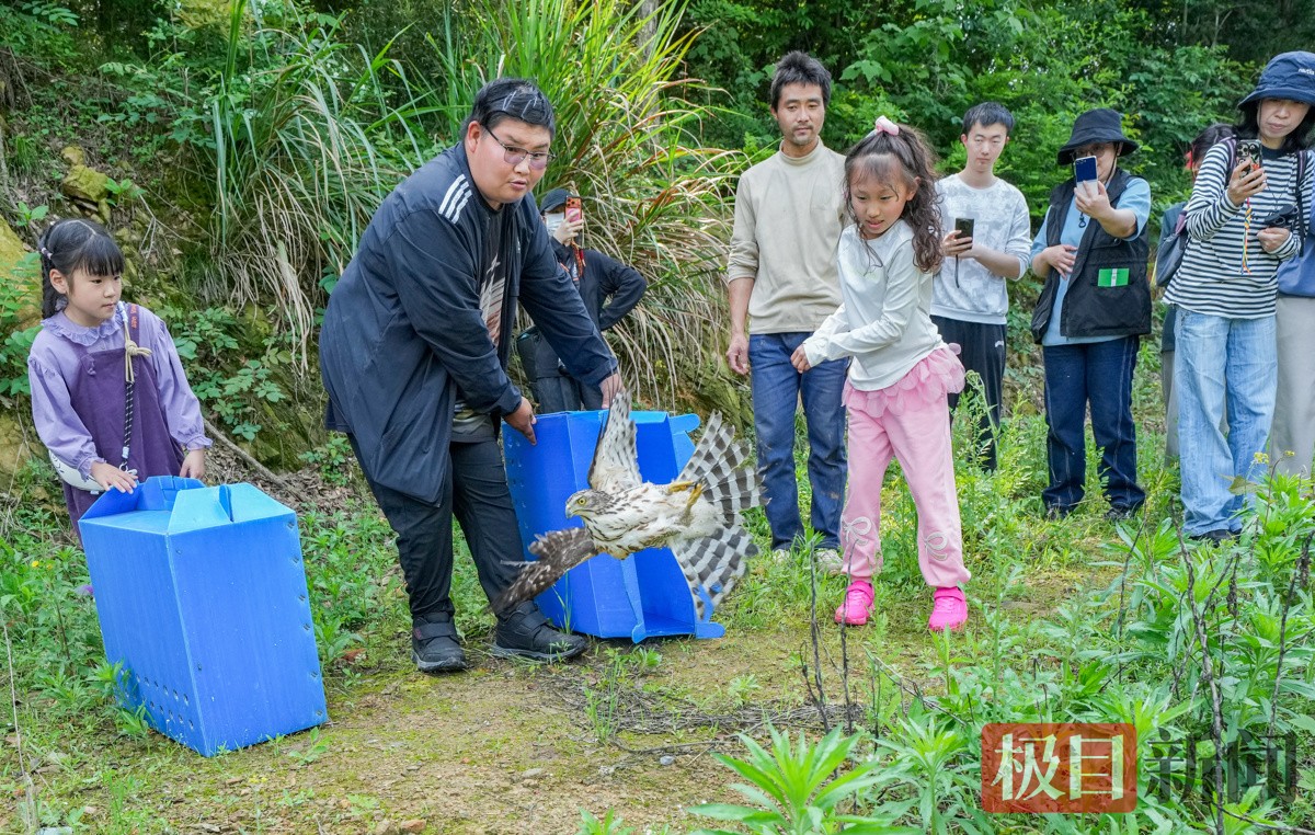 当天上午10时30分许,在科普完后,李思敏和志愿者们将两只佩戴定位器、已具备野外生存能力的凤头鹰带到山脚下,和志愿者一起放飞。