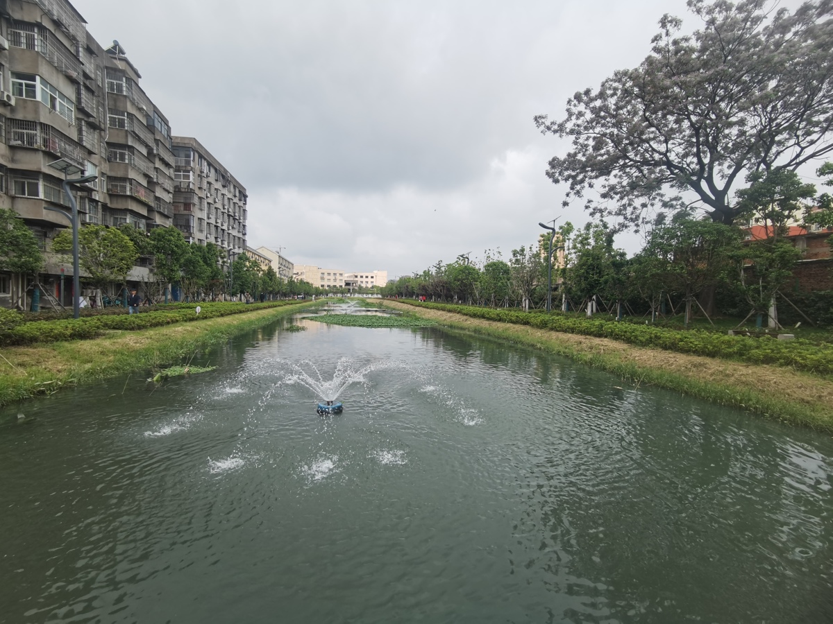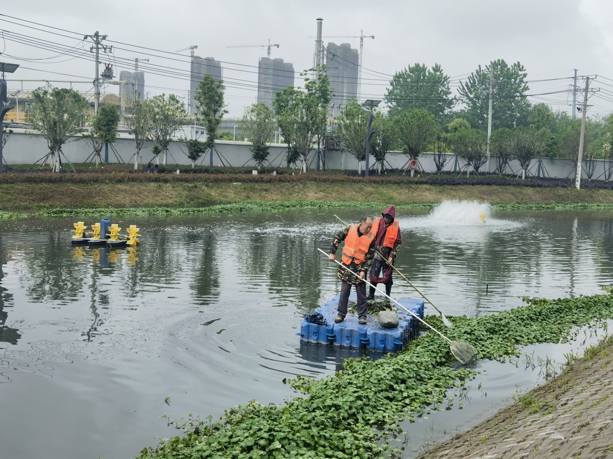 河道里,多种水生植物日夜在净化水质;曝气装置,划出一道道美丽的弧线;清漂队员划着小船,手持打捞工具,清理水中漂浮物,河水越来越清了。