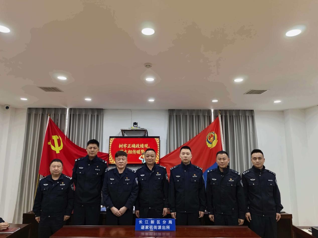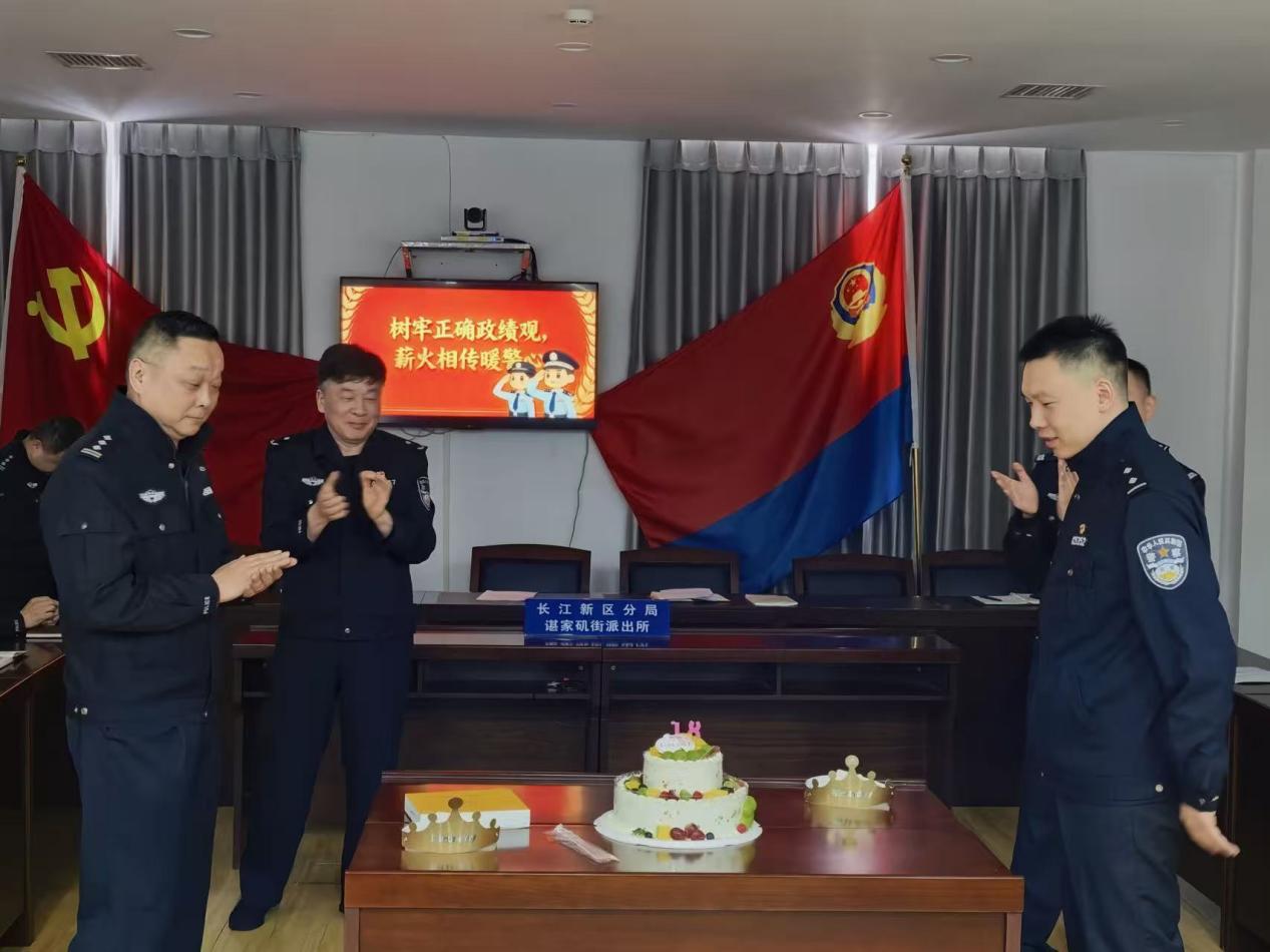 4月22日下午,在武汉市公安局长江新区分局谌家矶派出所,大家为即将离开岗位的60岁老民警邱建华庆祝生日。