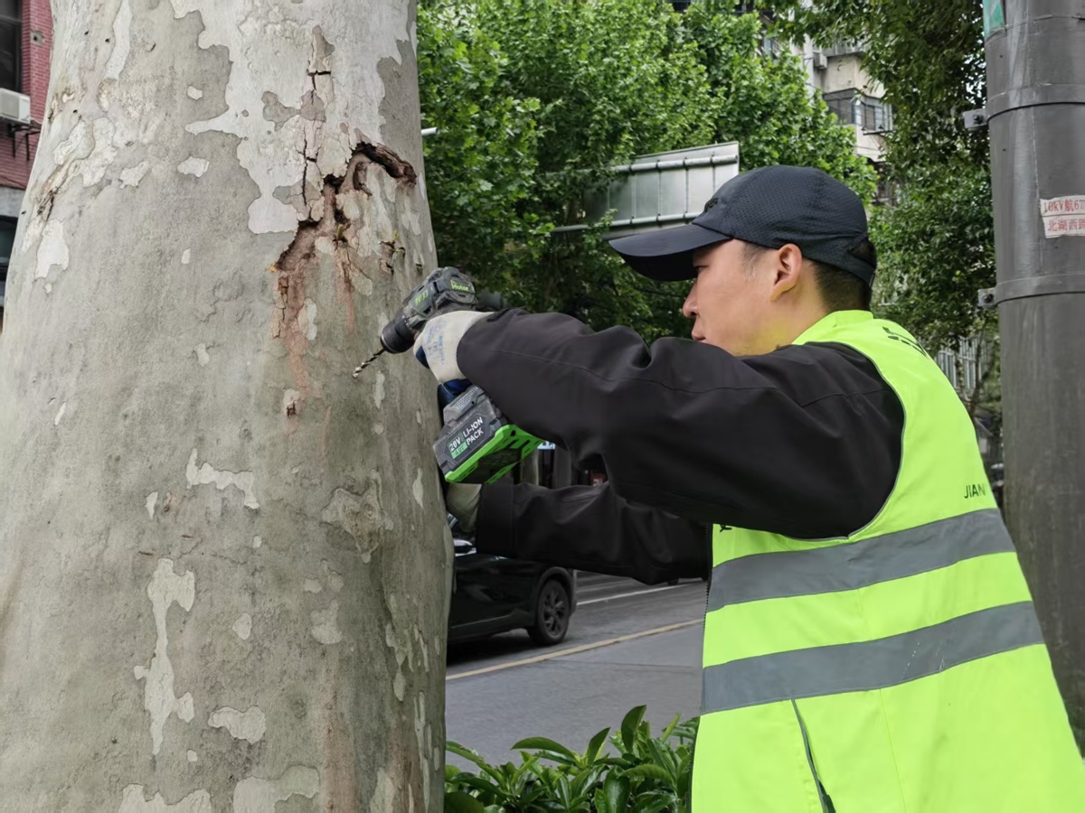 4月24日,在江汉区北湖西路,几名绿化工人正在围着一株法桐忙碌着。一人手持电钻,在树干离地约1.3米处斜向下钻出小孔,另一人取出一瓶药剂,旋盖、刺破封口,将“针头”稳稳插入孔中,让药液缓缓注入树体。这是江汉区城管执法局今年治理法桐飘絮的新试点,为法桐注射“飞絮抑制剂”。