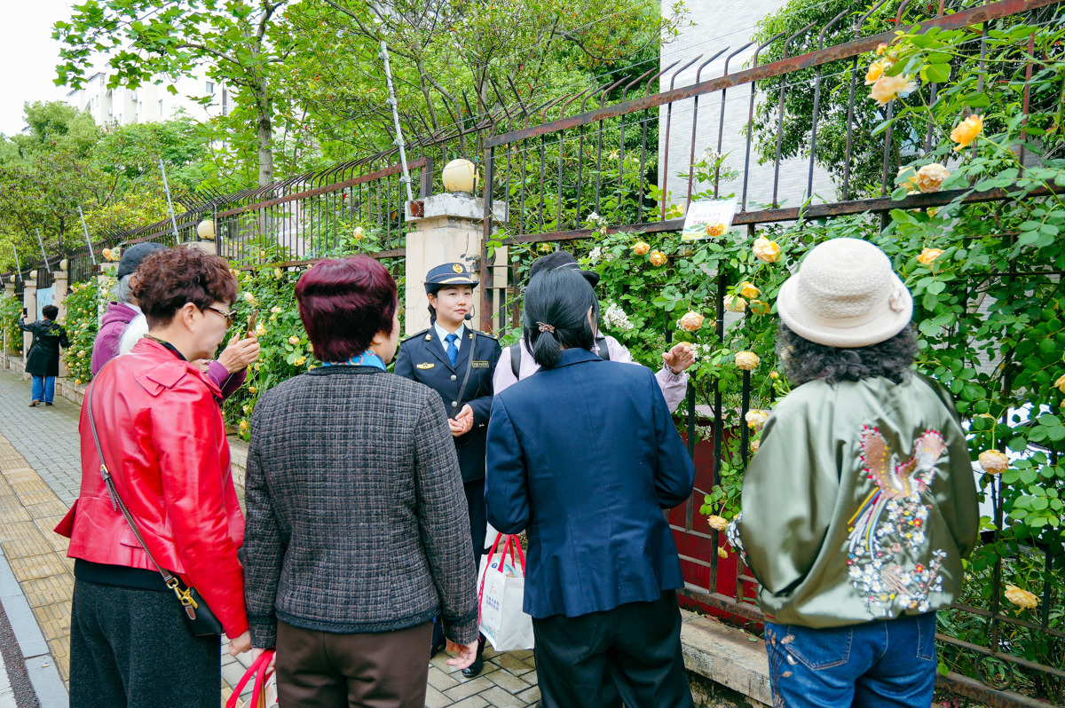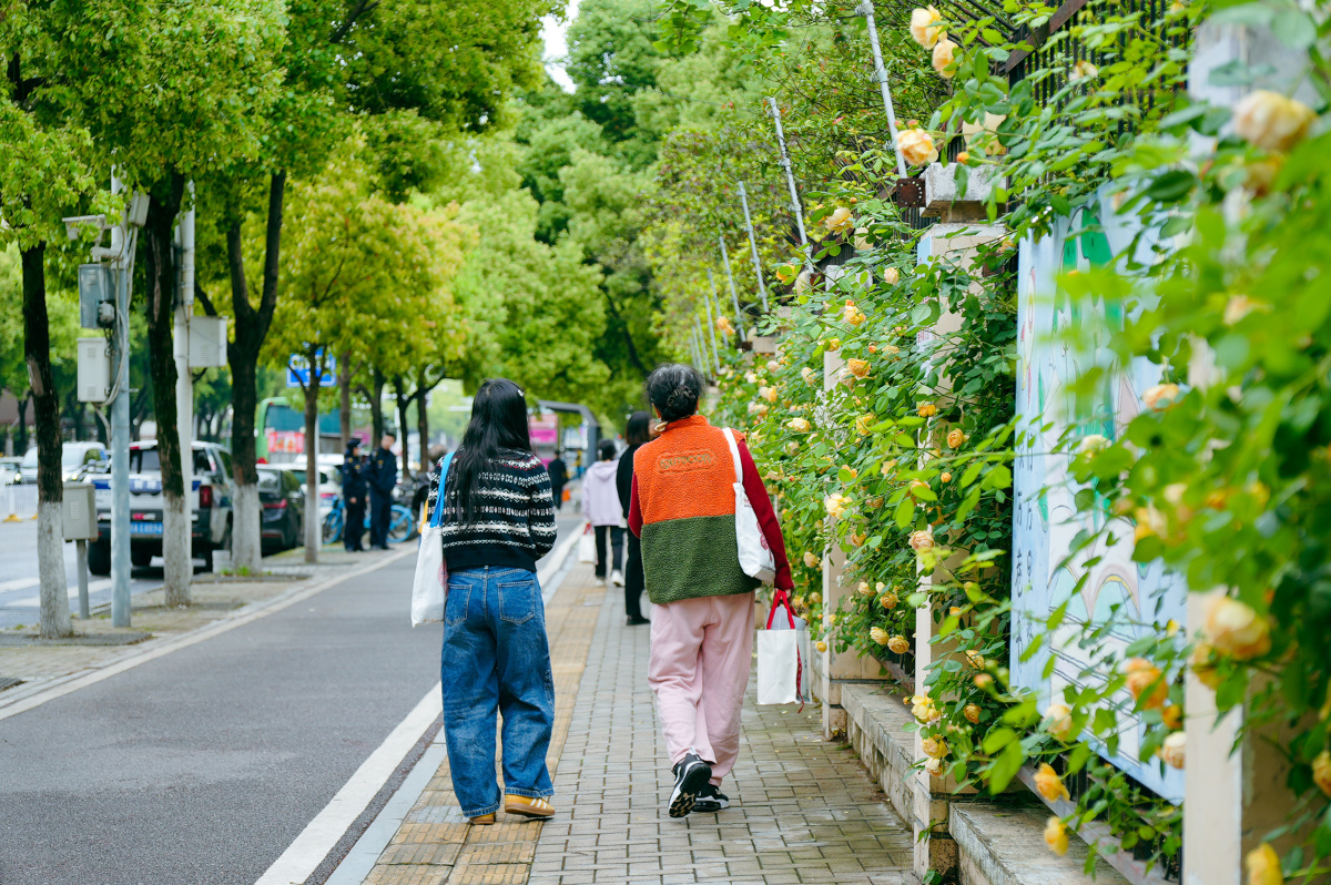 上午10点,室内讲座结束后,大家乘车前往10小区西门及学府南路的月季花墙实地打卡。层层叠叠的月季花朵绵延数米,如瀑盛放,花香沁人心脾。居民们驻足观赏、拍照留念,摄影爱好者纷纷定格花影美景,一路赞叹社区环境的美丽景致。“以前这里就是普通围栏,现在月季开得正旺,每天路过都忍不住多看几眼。”家住10村的李先生忍不住夸赞。