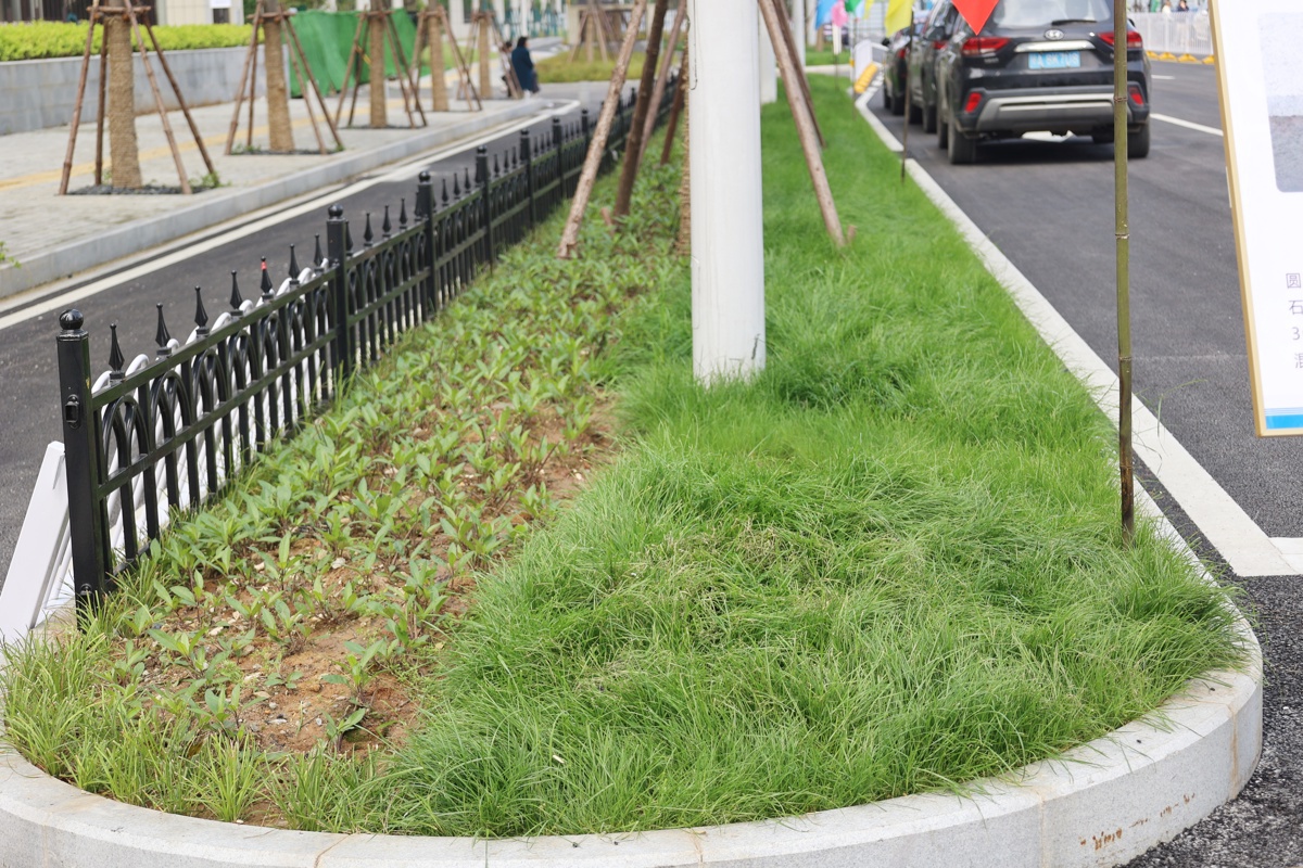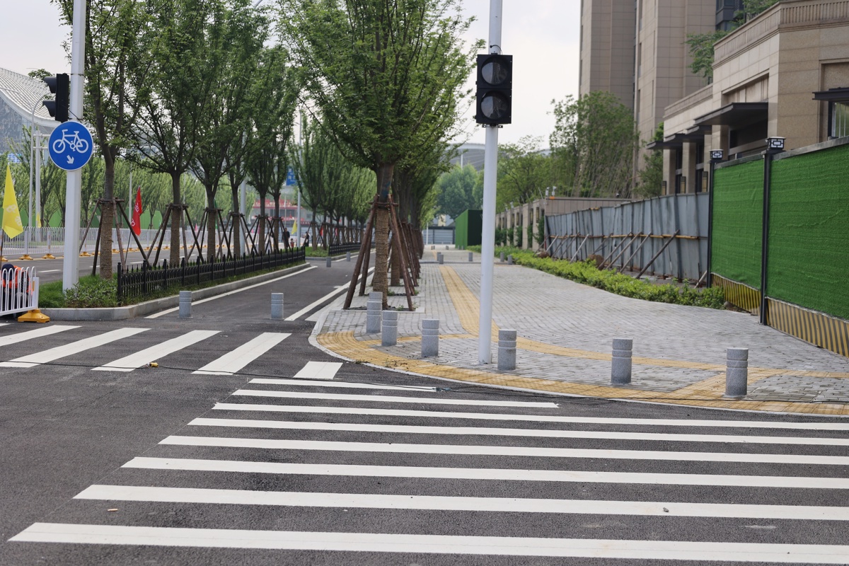 道路通车后,实现井盖与路面的平顺衔接;转弯处步砖通过前期精细化排布设计、施工交底与现场验收,兼顾通行安全与景观效果;圆弧形站石则通过工厂定制、卡扣控制缝宽、支模浇筑靠背等方式,打造出流畅规整的道路边缘。同时,无障碍通道、隐形井盖、雨水箅子、景观绿化等配套设施同步高标准建设,让道路不仅“通行顺畅”,更兼具“颜值与温度”。