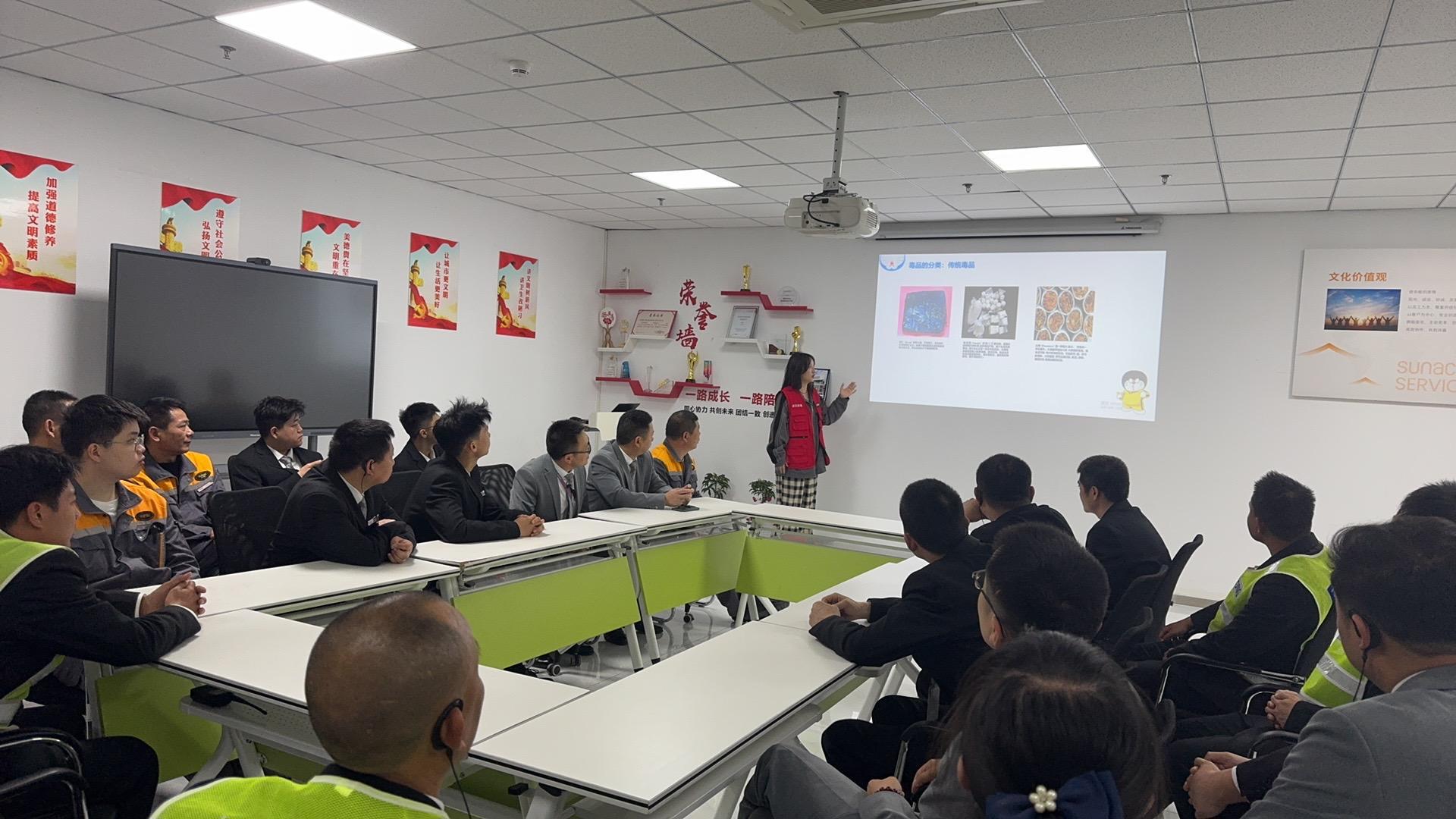 宣讲环节,禁毒社工借助PPT投影,结合企业园区物业工作特性,开展沉浸式、专业化禁毒知识讲解。系统讲解毒品的基础定义、三大传统分类,重点围绕当下隐蔽性极强、危害范围广的第三代新精神活性物质,以及极易被忽视的危险化学品如笑气、丁烷等,详细拆解其外观伪装、成瘾性、身体危害及法律后果,让大家清晰认清新型毒品的真面目。