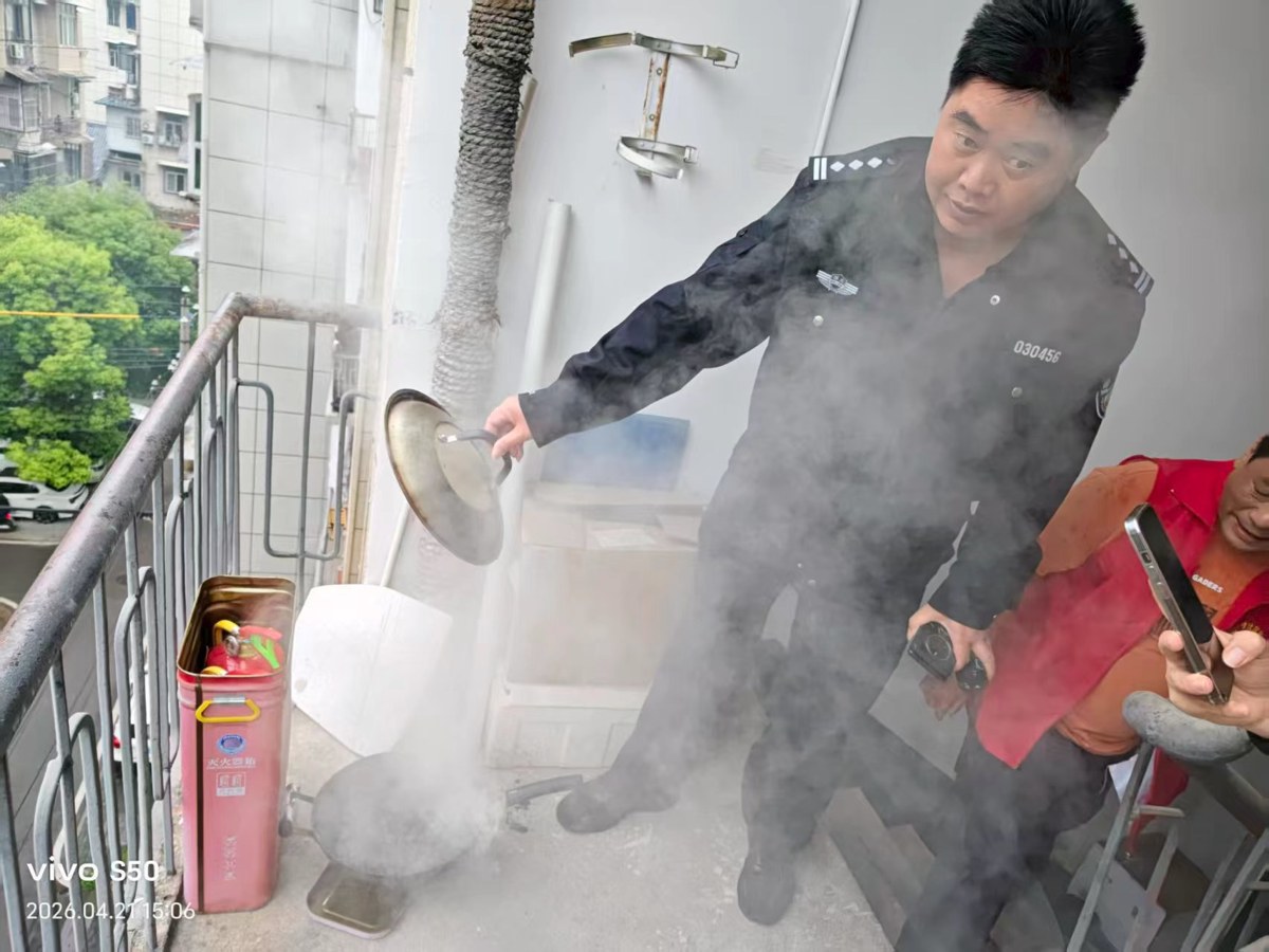 唐进喜带着义警队员老陈、老陶连忙上前探明情况,发现浓烟来自5楼住户舒先生家。因舒先生不在家,房门为密码锁,唐进喜一边紧急联系舒先生获取密码,一边安排义警准备灭火器、疏散围观居民、划定安全区域。拿到密码后,唐进喜带领老陶、老陈迅速打开房门,发现厨房内铁锅烧红、有隐约火光,火势处于初期蔓延阶段。三人立即分工协作,对准火源喷射灭火器、移出烧红的铁锅,彻底切断火源隐患。随后,关闭燃气总阀门和电源,开窗通风散味。