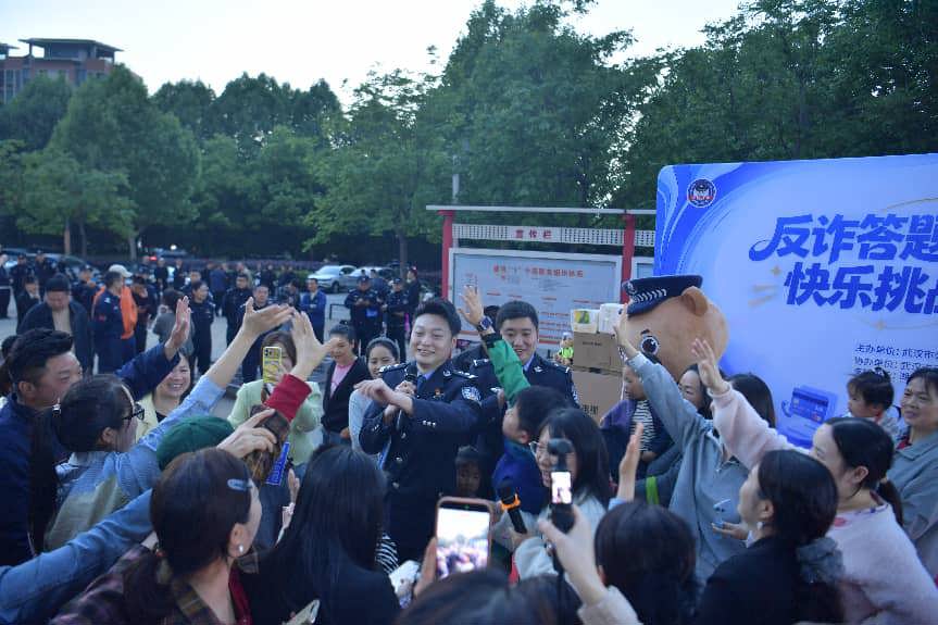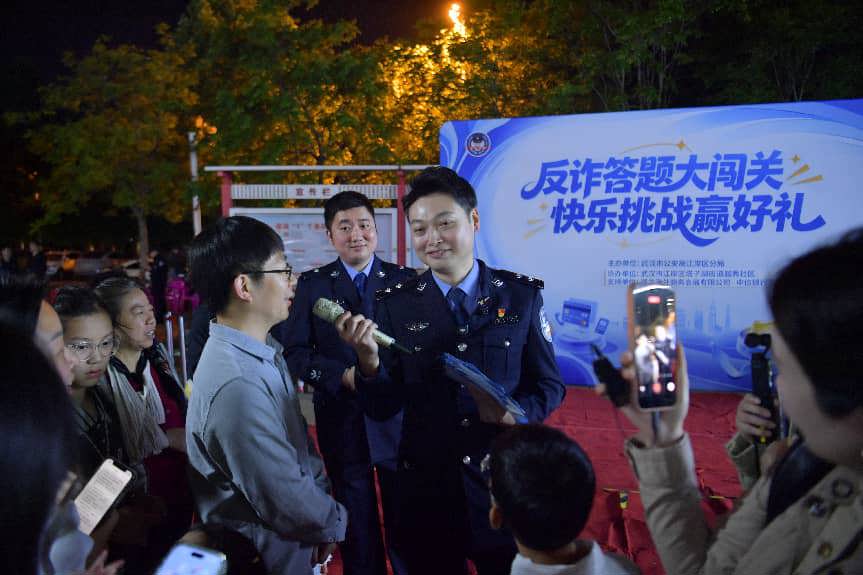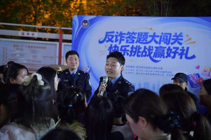 “各位邻居,答对反诈题目就能把警察小熊、65寸小米电视机抱回家,这好事儿可不是天天有!”江岸公安反诈民警潘黎的吆喝声,引得居民们纷纷围拢。傍晚6时30分,小广场上比白天更热闹,巨大的反诈宣传展板前人头攒动,音乐声、欢笑声、抢答声交织。武汉市公安局江岸区分局将一场别开生面的反诈宣传活动搬到了居民家门口。