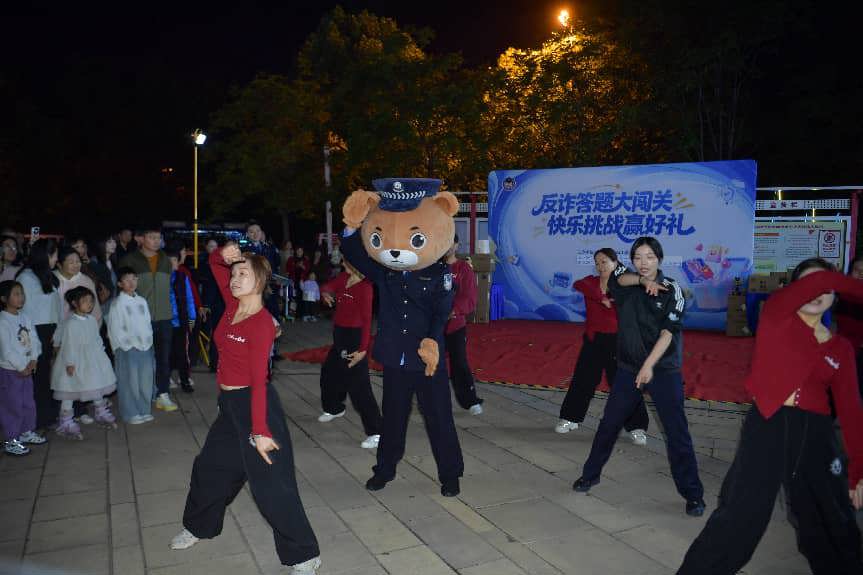 随着原创反诈歌曲流淌而出,“平安”一会儿比心,一会儿做出“不听、不信、不转账”的手势,顶着圆滚滚的大脑袋,努力跳起自编的舞蹈,惹得孩子们咯咯直笑,人们纷纷举起手机记录这一幕。歌词里反复出现的“陌生链接不点击”“验证码是最后一道锁”,就这样伴着旋律悄悄钻进了每个观众的脑海里。