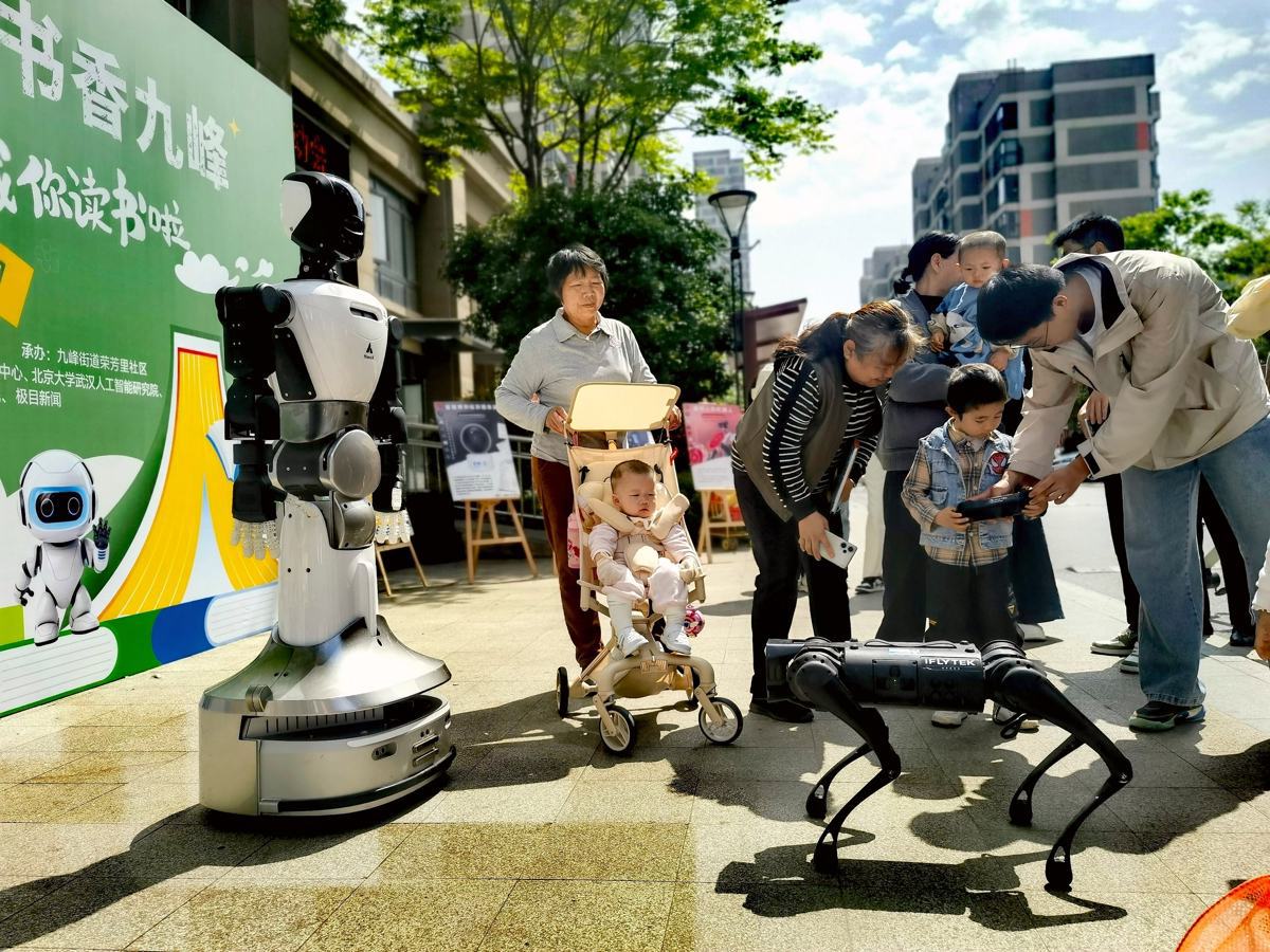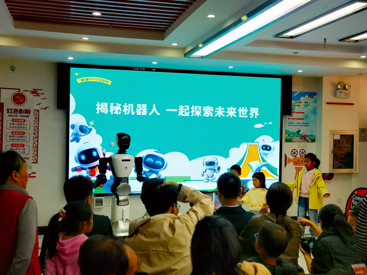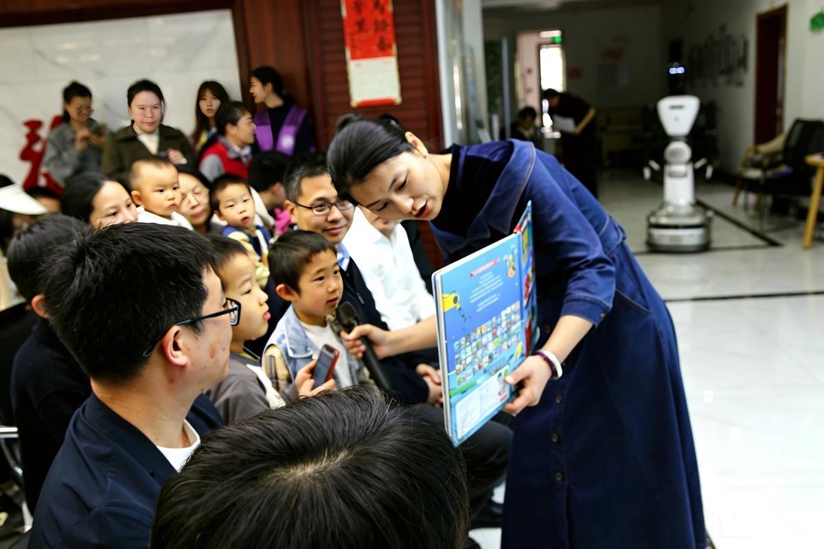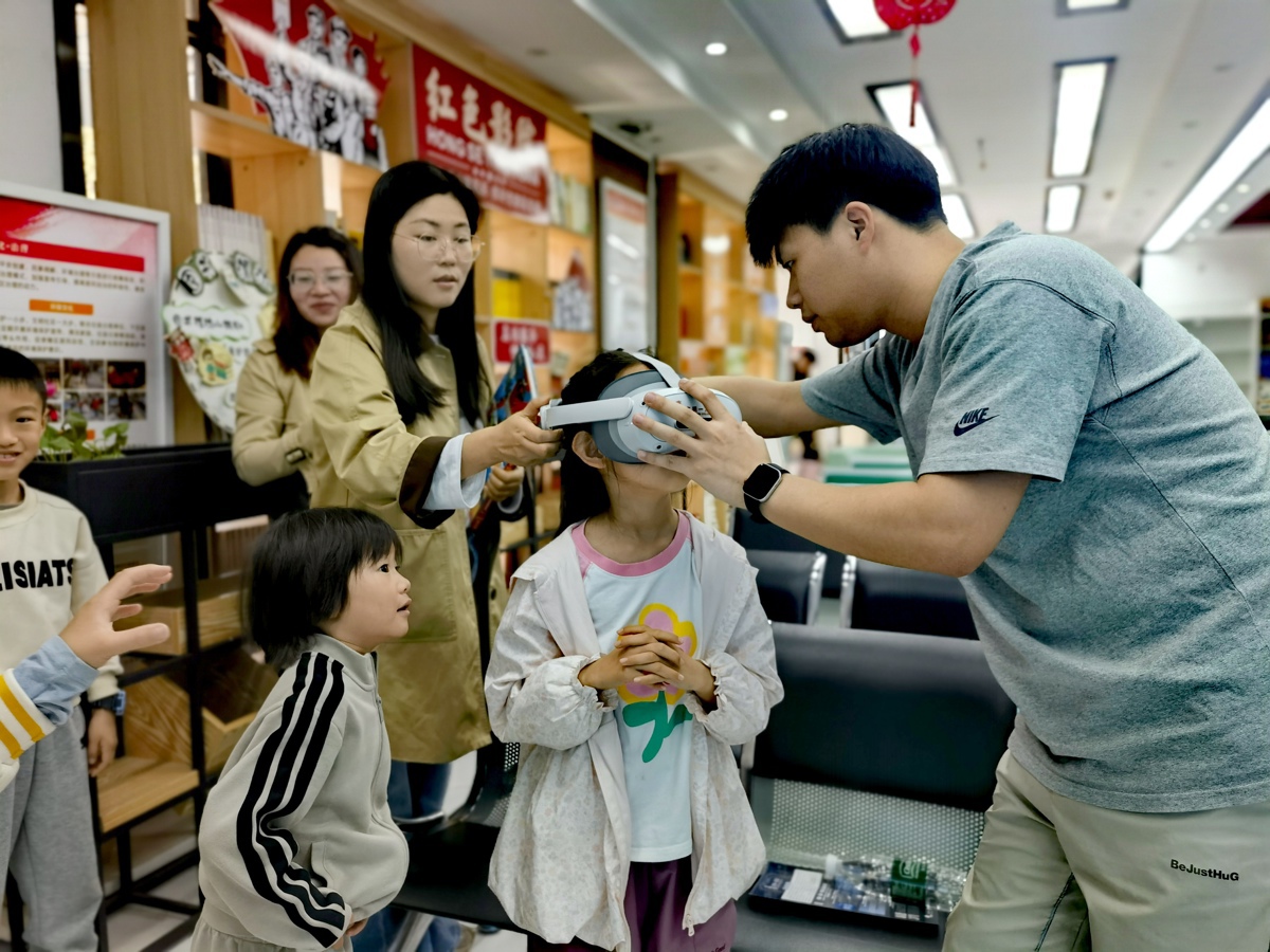 这场活动没有刻板说教,整合了辖区内科创资源、高校院所、知识产权专业机构,把绘本课堂、智能互动、科普体验搬进社区,请来轮式人形机器人、四足机器人(机器狗)、VR穿戴设备等智能设备搬到阅读现场。25组亲子家庭到场全程趣味互动,享受新的阅读体验。