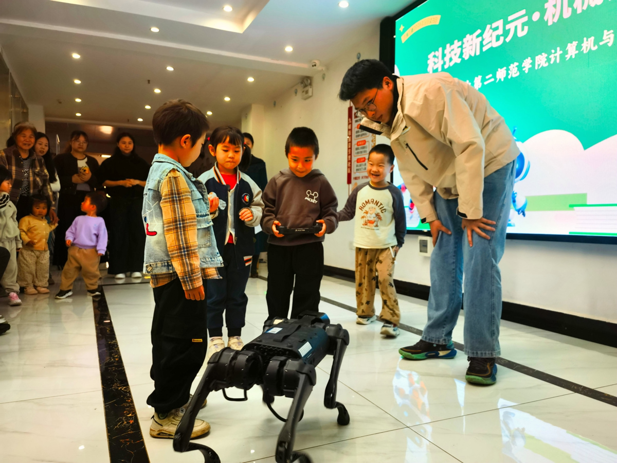 湖北第二师范学院计算机与人工智能学院师生团队携机械狗到场亮相,四足仿生机器人灵活完成穿梭行走、精准避障等任务,孩子们排队上前近距离打卡体验,直观感受硬核科技力量,拓宽科普阅读视野。