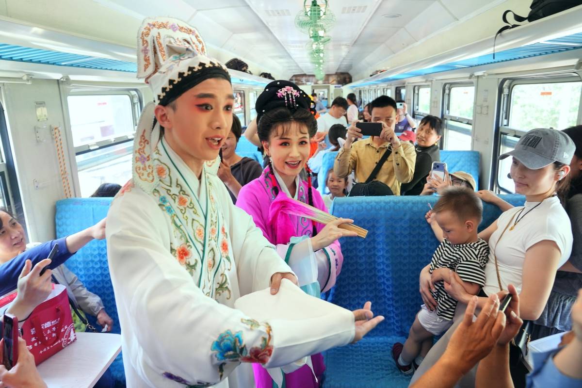 12号车厢里,楚剧《送表妹》正在上演。表演者杨佳岑穿梭在过道,与旅客近距离互动。演出结束后,不少旅客争相与她合影。她说:“让大家在旅途中不经意间就接触到楚剧,这种感觉特别好。”