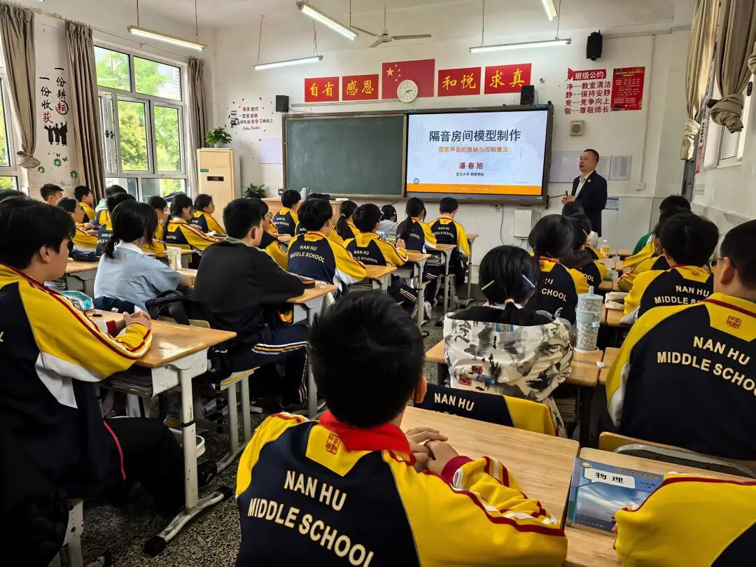 近日,一场别开生面的科学实验课在武昌区南湖中学火热开讲,武汉大学物理学院二级教授、博士生导师潘春旭先后带来“隔音房间模型制作”“制作望远镜——光学原理与实验”等趣味实验课程,点燃了孩子们对声学与光学的探索热情。