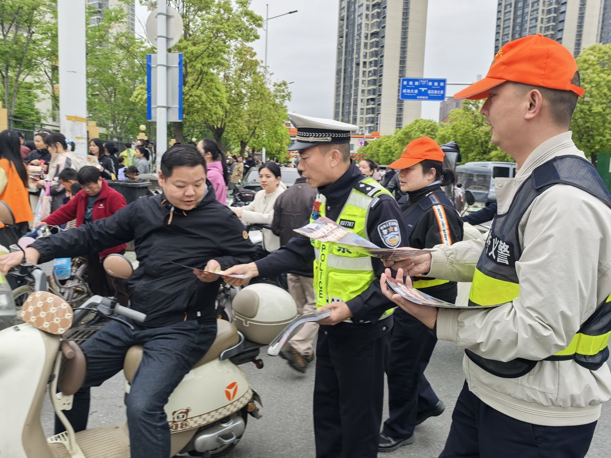 2026年4月23日下午5时,正值放学高峰,武汉市蔡甸区实验小学门口人流和车流交织。然而,秩序井然的景象中,一群身着反光背心的身影格外引人注目——武汉市公安局蔡甸区分局交管大队二中队政治指导员李辉、民警李军红带领蔡甸交管义警,忙碌而有序地开展交通安全宣传与秩序劝导工作。