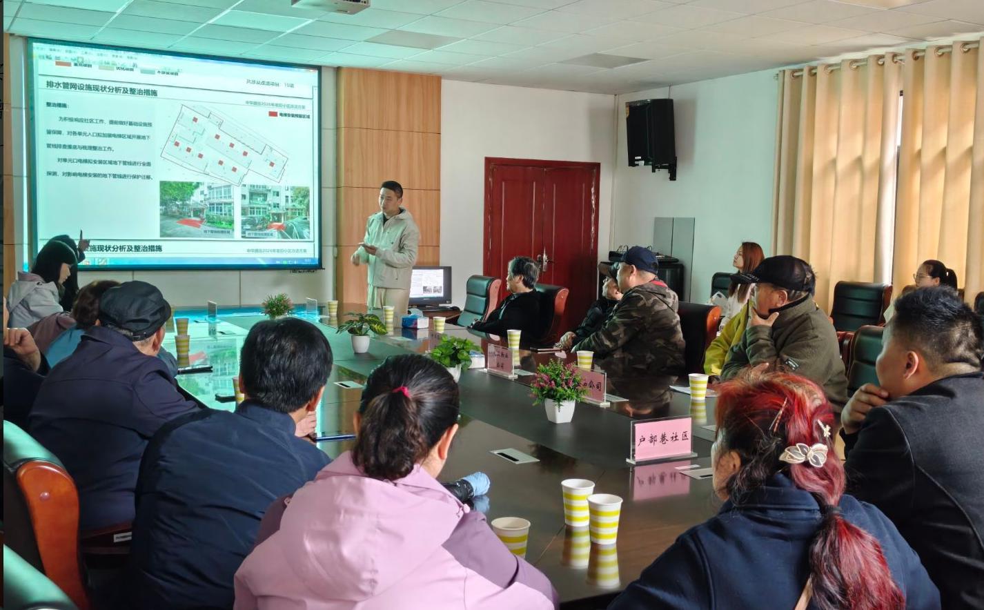 近日,武昌区户部巷社区二楼协商议事厅气氛热烈,社区、中华路公寓业委会、大卫物业及居民代表齐聚一堂,召开三方联动协商会议,共谋红色物业提质增效、老旧小区改造提升等民生大事。