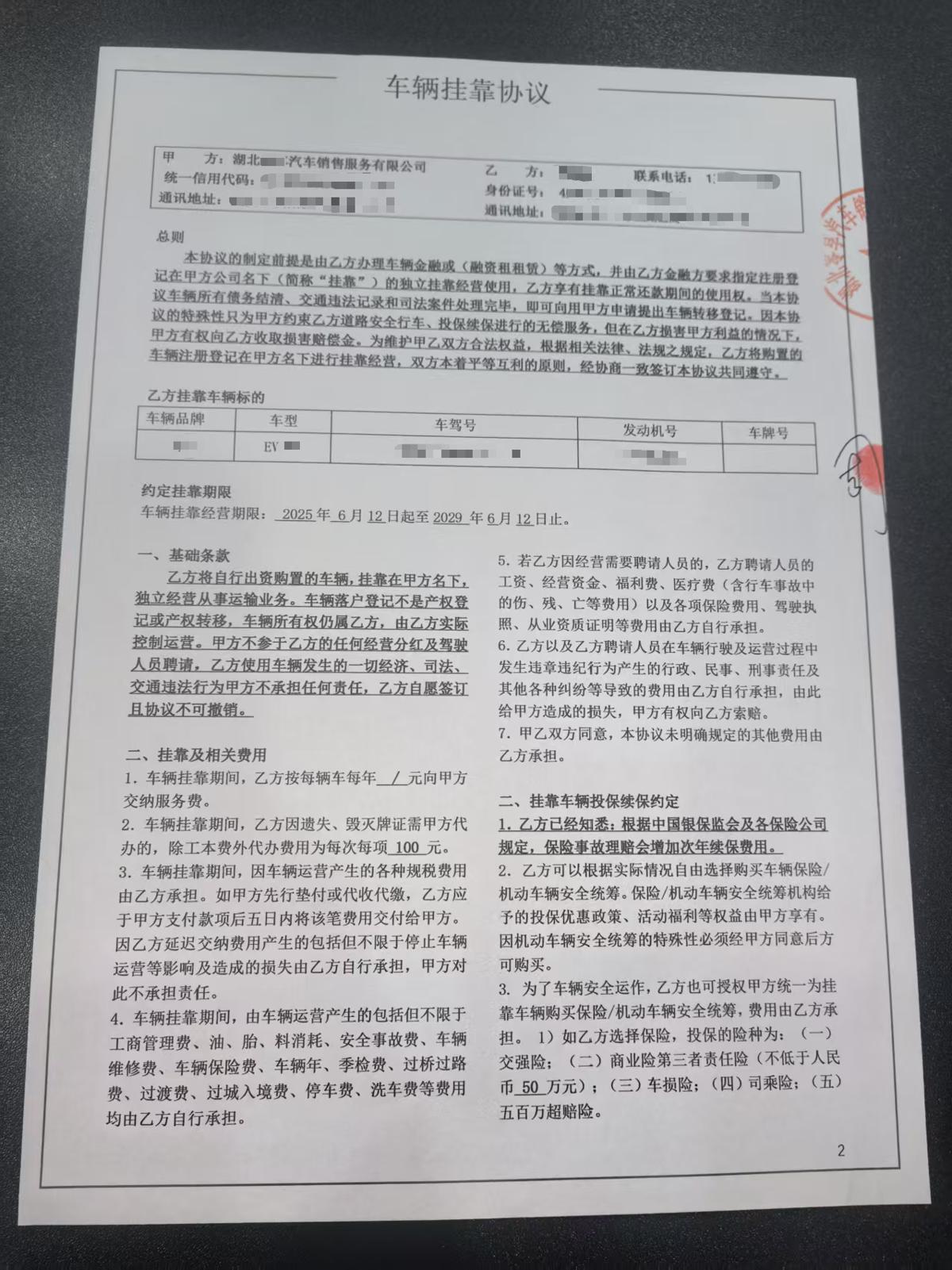 “工作人员告诉我,我还有好几万元的贷款没有还清,当时我一下子就懵了。”周先生赶忙翻出当时签订的协议仔细查看,这才发现自己签署的车辆挂靠协议中标注,该协议签订前提是乙方办理车辆金融或(融资租租赁)等方式,并由乙方金融方要求指定注册登记在甲方公司名下的独立挂靠经营使用,挂靠期限从2025年6月12日至2029年6月12日。