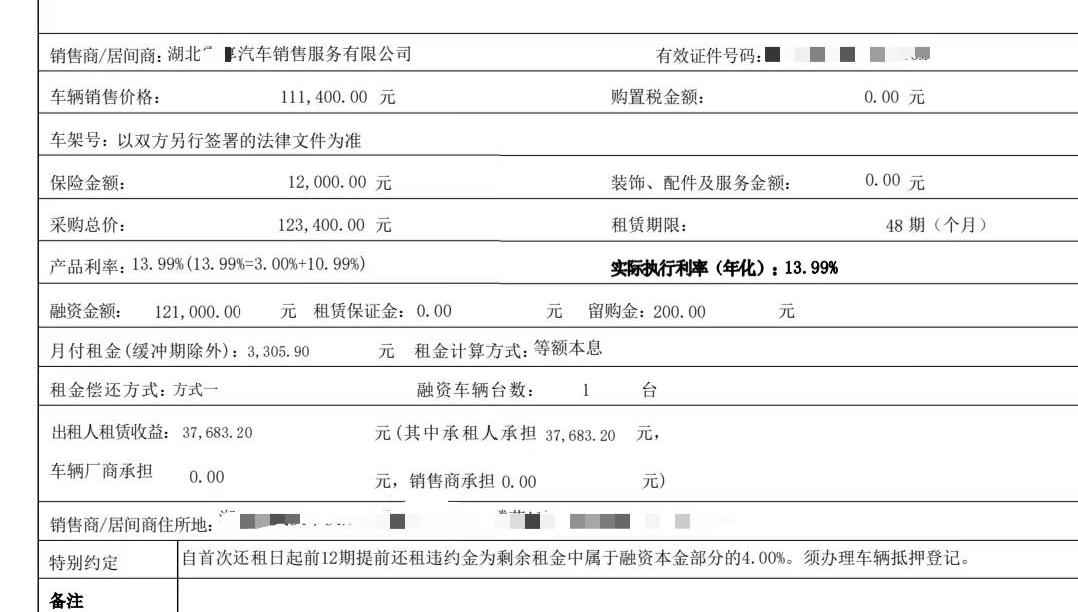 记者查看周先生所签的汽车融资租赁(售后回租)合同发现,周先生办理的是零首付车辆贷款,车辆裸车价11.14万元,保险费1.2万元,总金额12.34万元。贷款期限48个月,融资金额12.1万元,年化利率13.99%,每月需还款3305.9元,贷款利息共37683元。直到此时,周先生才明白,自己每月交的并非租车租金,而是车贷,原本的求职行为,变成了贷款购车。