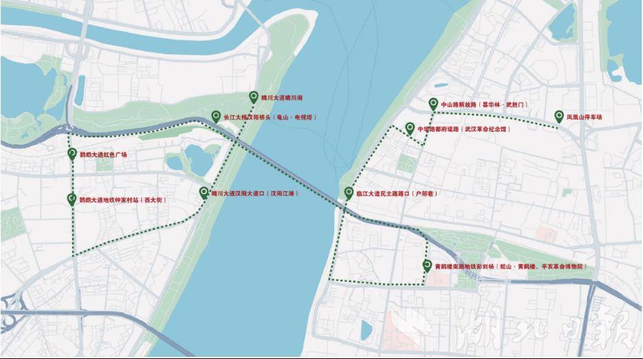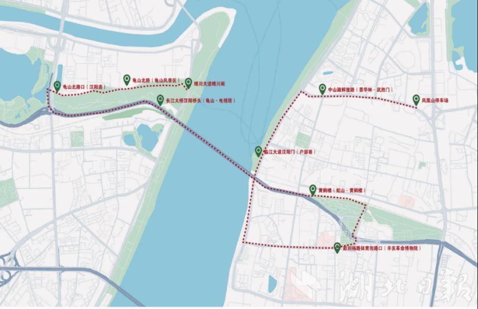 “江汉揽胜”旅游巴士单边全长12公里,上行起于武昌凤凰山公交停车场,止于汉阳晴川大道晴川阁,双向覆盖中山路、临江大道、长江大桥、鹦鹉大道等核心路段。全程共设10个站点,一站式串联起昙华林、户部巷、辛亥革命博物院、黄鹤楼、龟山、古琴台、晴川阁等武汉最具代表性的文旅资源。
