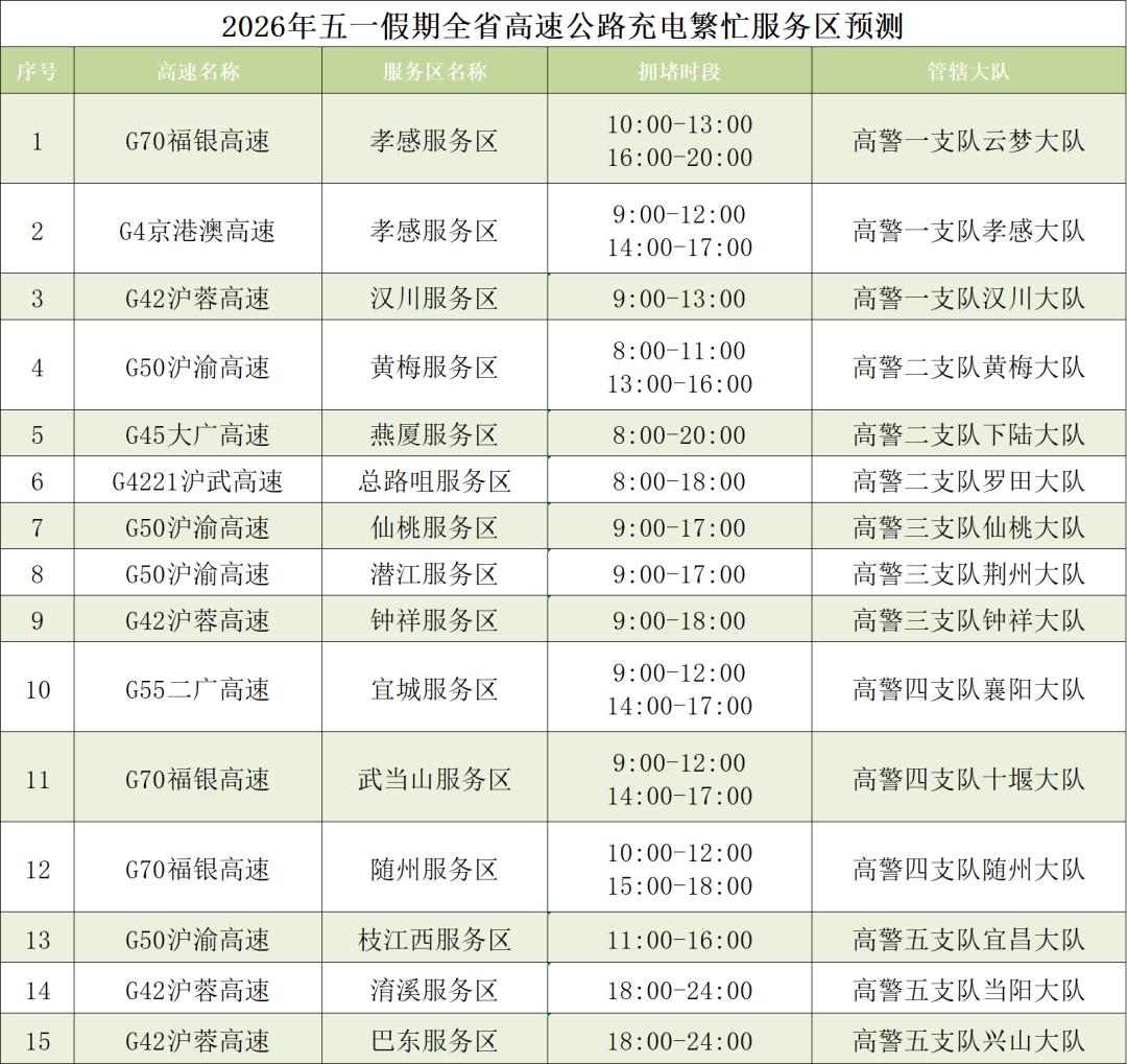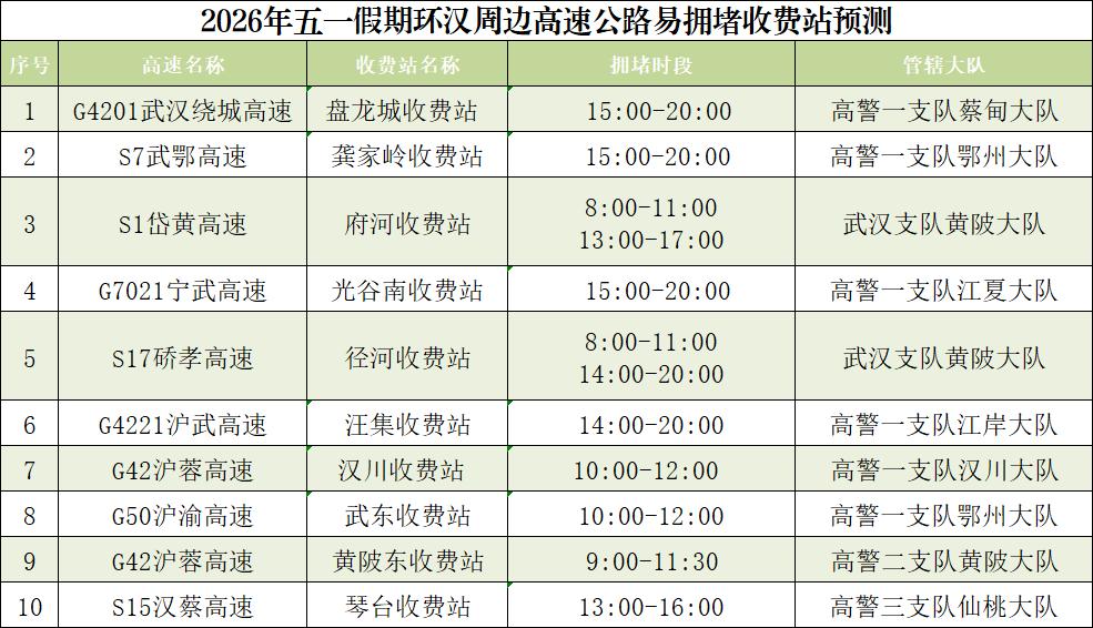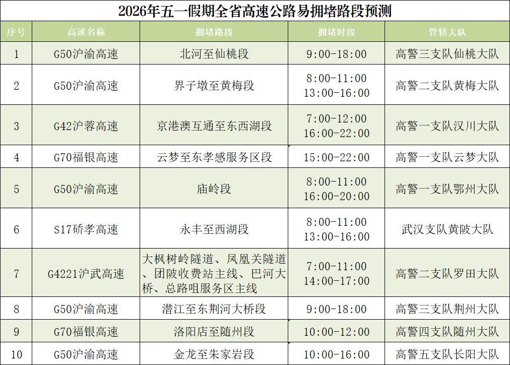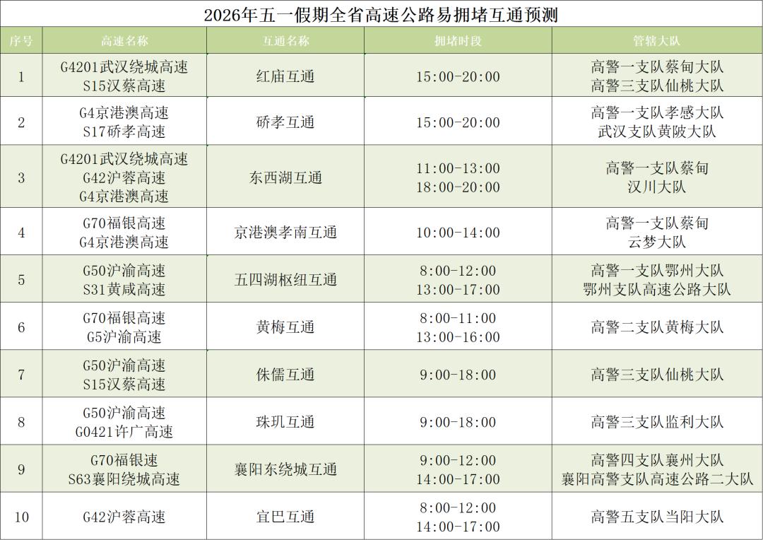 预计沪渝高速仙桃、荆州、黄石、鄂州、长阳、巴东、宜昌段,沪蓉高速汉川、当阳、钟祥、黄陂段,福银高速云梦、十堰、随州段,武鄂高速鄂州段,京港澳高速孝感段,武汉绕城高速蔡甸、江夏段,武监高速武汉段,沪武高速江岸、罗田段,二广高速襄阳段,硚孝高速东西湖段等高速路段缓行可能性较高。