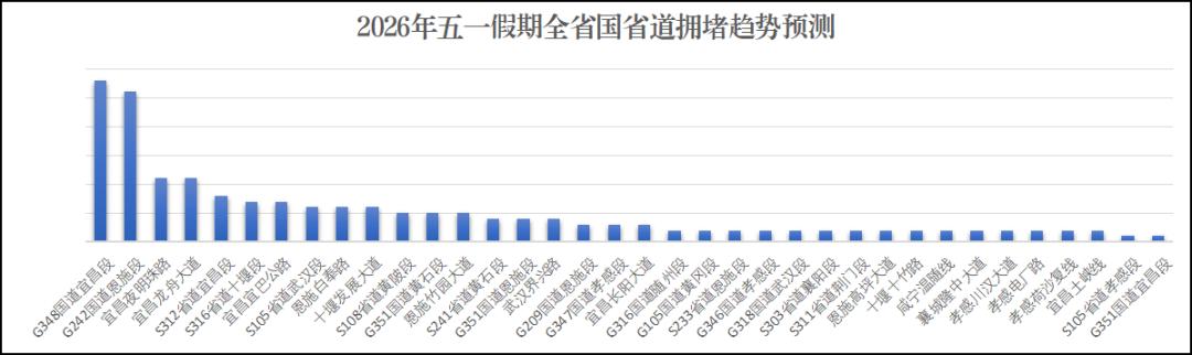 G348国道宜昌段,G242国道、G351国道恩施段,G351国道黄石段,S312省道宜昌段,S316省道十堰段,S105省道武汉段,S108省道黄陂段,S241省道黄石段等国省道路段缓行可能性较高。