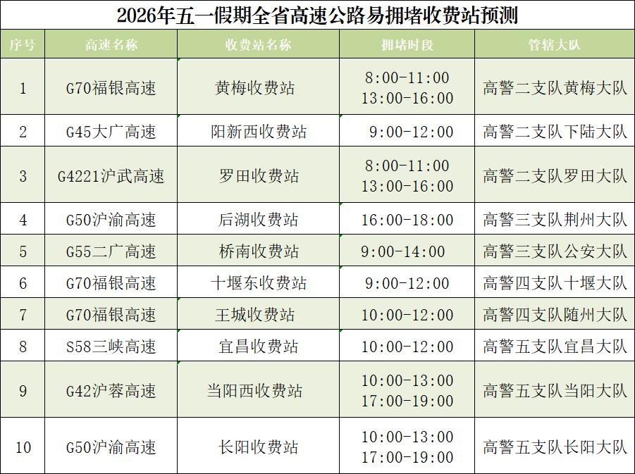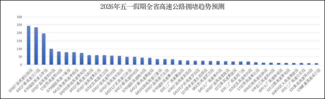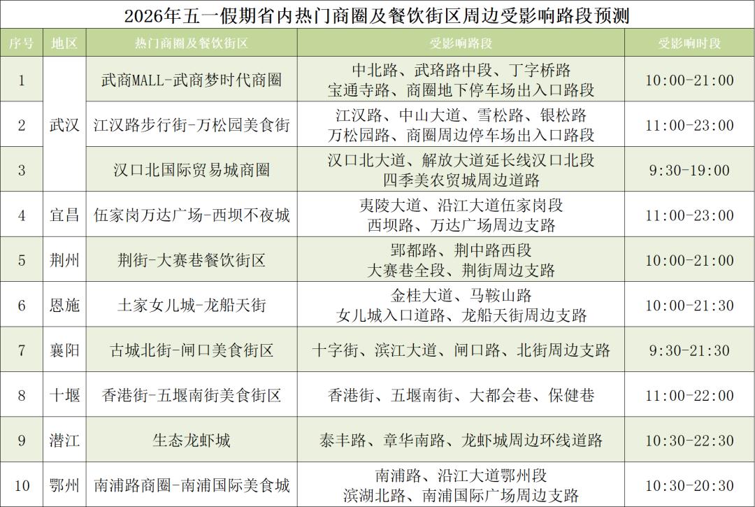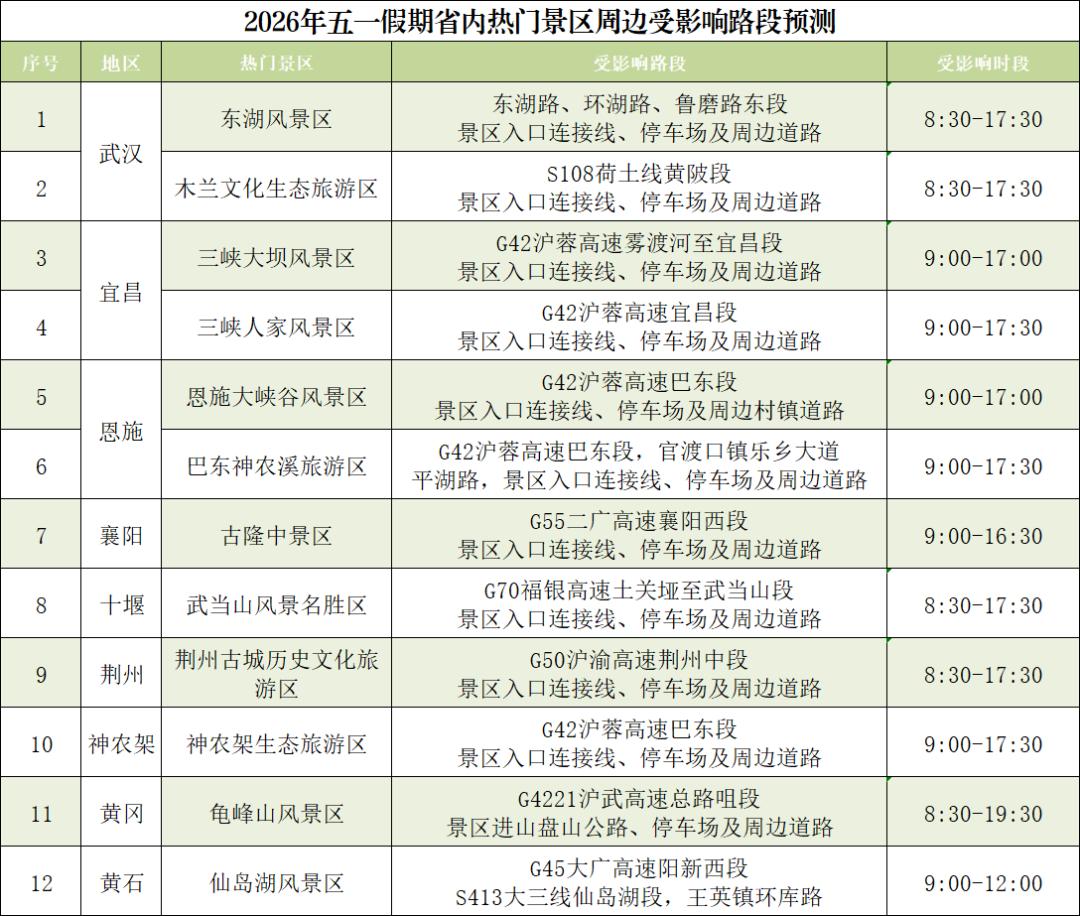 “五一”假期各地将举办多场次大型文娱活动,其中“楚超”将在武汉、黄石、鄂州、随州、孝感、荆门等地举行,将吸引大量球迷观赛,襄阳“2026盛世唐城沉浸式实景演出季(五一专场)”预计人流量达18万人次,“2026武汉都市花展”、“2026荆州楚文化节沉浸式国风盛典”将吸引超15万人次参加,“2026武汉仙人掌音乐节”“周深2026【深深的】巡回演唱会-武汉站”将吸引12万乐迷参加。届时,相关活动场所周边道路人流、车流短时聚集,路网超饱和运行,缓行概率高。