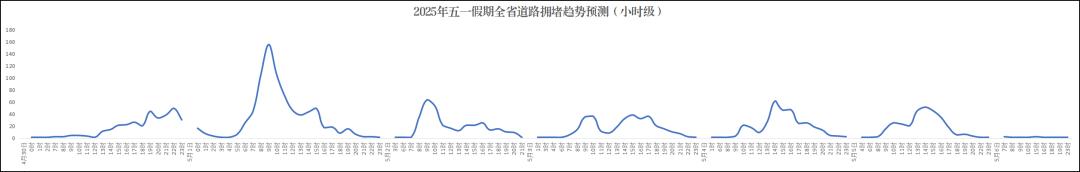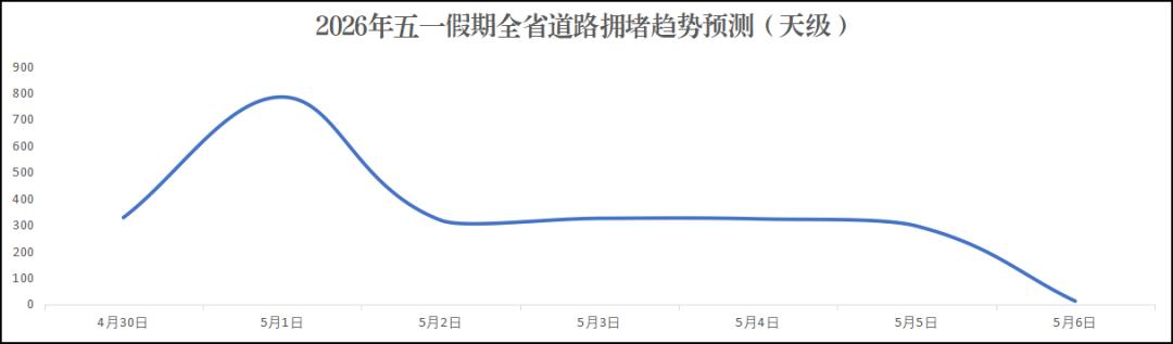 4月30日15时开始,路网流量逐步上升,5月1日9时至12时迎来假期出行高峰。省内大中城市部分进出城路段、热门景区、网红打卡点周边路网压力增大,高速公路部分互通路段、收费站、服务区等流量饱和易缓行。5月2日至5日,在网流量总体均衡;5月6日(假期后一日),路网恢复正常。