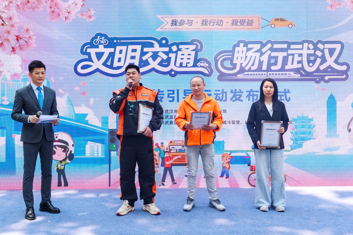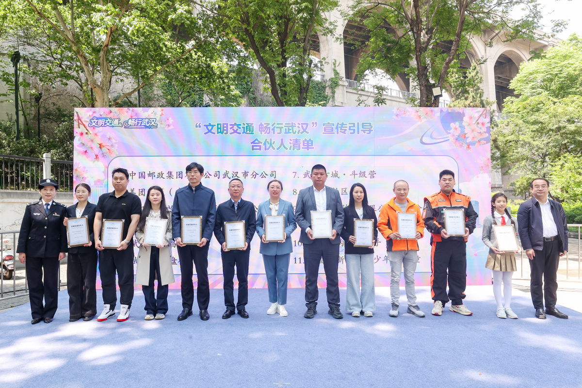 活动现场,中国邮政武汉分公司、美团配送、风韵出行等企业,天佑医院、武昌医院等医疗机构,棋盘街小学、斗级营、户部巷社区等单位和滴滴出行平台网约车司机、淘宝闪购外卖骑手、新时代好少年等个人,接过“文明交通合伙人”纪念牌。