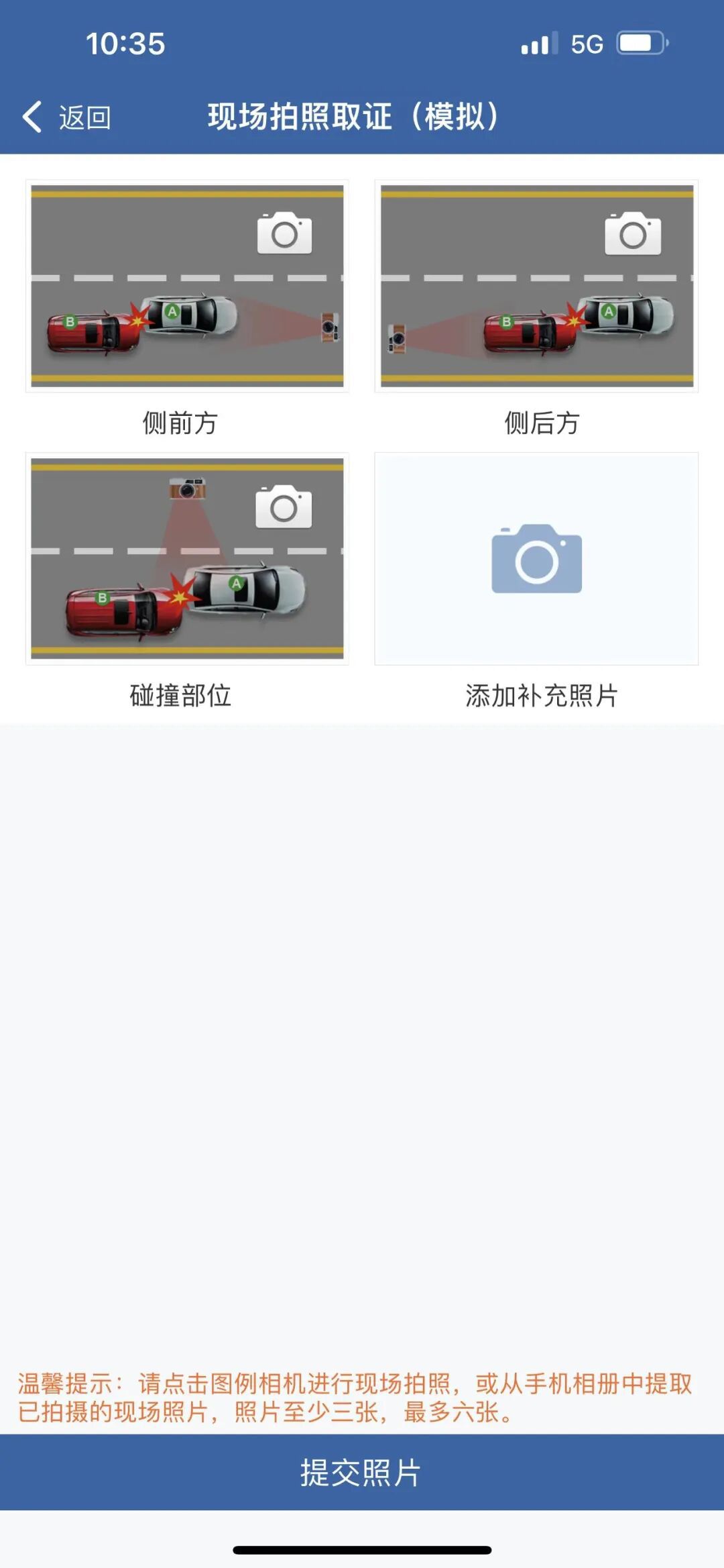 进入现场拍照取证的界面,拍摄3-6张照片,包含侧前方、侧后方和碰撞部位,点击【协商责任】,上传证件照片。
