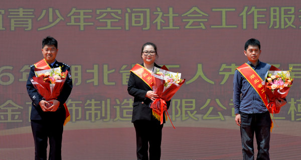 3名省级先进代表合影。从左至右:李志强、赵丽娟、新金首饰工模组代表