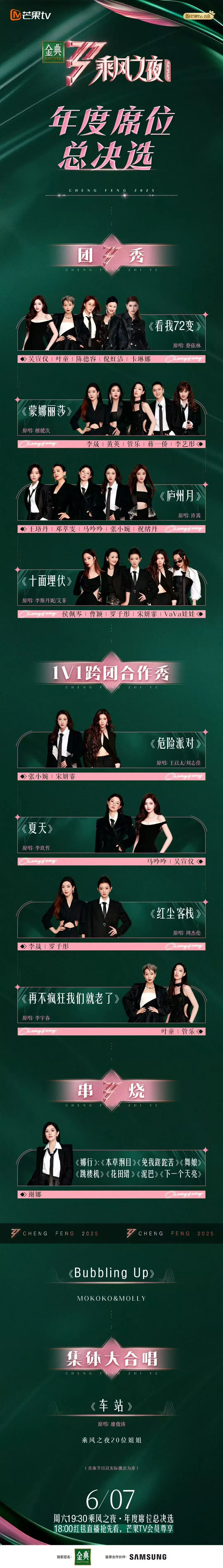 6月7日晚,芒果TV自制国际女性文化交流与音乐竞演综艺节目《乘风2025》在呼伦贝尔草原开启乘风之夜·年度席位总决选直播,进入总决选的20位姐姐通过八个精彩舞台,全力争夺十个年度席位。除此之外还颁发了年度乘风舞台、年度乘风超越奖、乘风年度队长、乘风年度总冠军等。