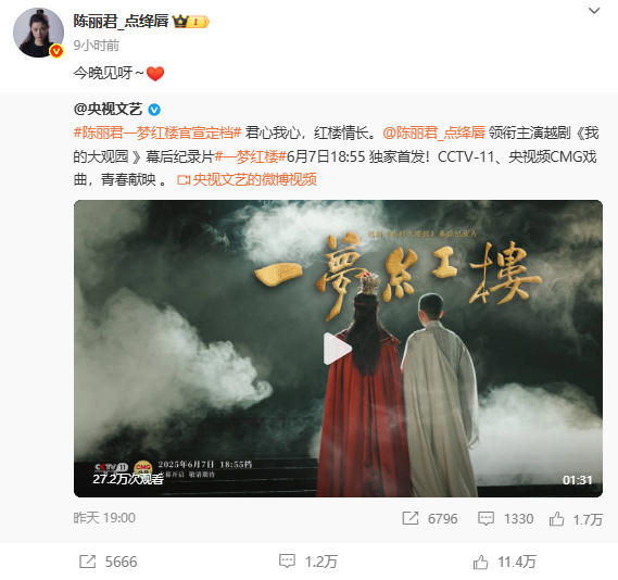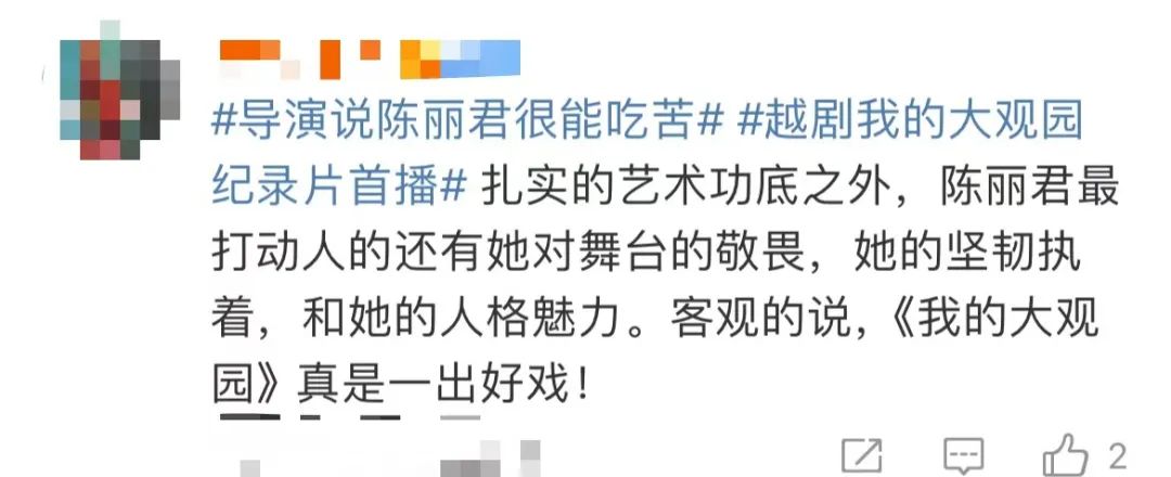 6月7日,越剧《我的大观园》幕后纪录片播出。越剧演员陈丽君在社交平台发文。