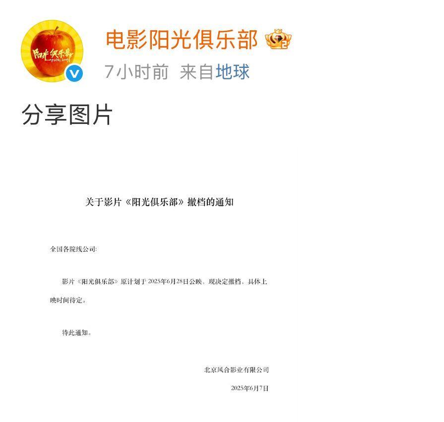 上个月,《阳光俱乐部》宣布将于6月28日上映,黄晓明也积极为该片做映前宣传。但最终,片方还是发出了这份通知:“影片《阳光俱乐部》原计划于2025年6月28日公映,现决定撤档,具体上映时间待定。”