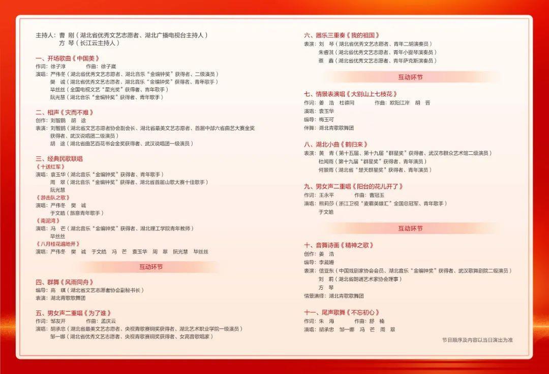 诠释抗洪精神伟力。相声《灾而不难》以诙谐智慧传递信念力量;群舞《风雨同舟》以震撼的肢体语言生动演绎了万众一心、共克时艰的磅礴伟力;男女声二重唱《为了谁》以深情温暖的旋律,抒发了对无私奉献的抗洪勇士们的崇高敬意。