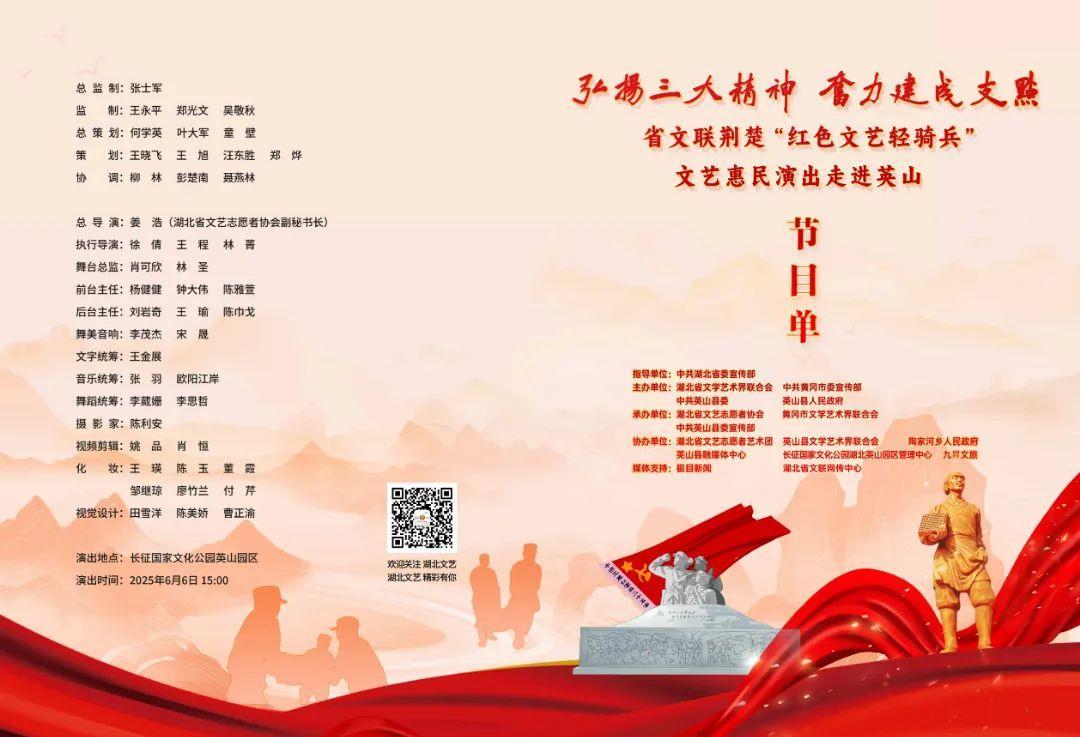 6月6日,“弘扬三大精神 奋力建成支点”湖北省文联荆楚“红色文艺轻骑兵”文艺惠民演出在长征国家文化公园英山园区隆重举行。现场近千名观众、近百万名线上网友,共沐艺术薪火、感受革命精神。 整场演出紧扣“三大精神”主题,通过精心编排的文艺节目,深刻诠释了时代内涵。