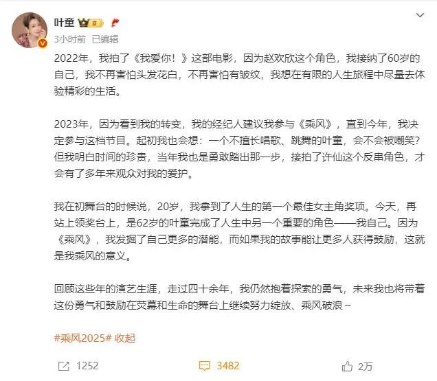 我在初舞台的时候说,20岁,我拿到了人生的第一个最佳女主角奖项。今天,再站上领奖台上,是62岁的叶童完成了人生中另一个重要的角色——我自己。因为《乘风》,我发掘了自己更多的潜能,而如果我的故事能让更多人获得鼓励,这就是我乘风的意义。