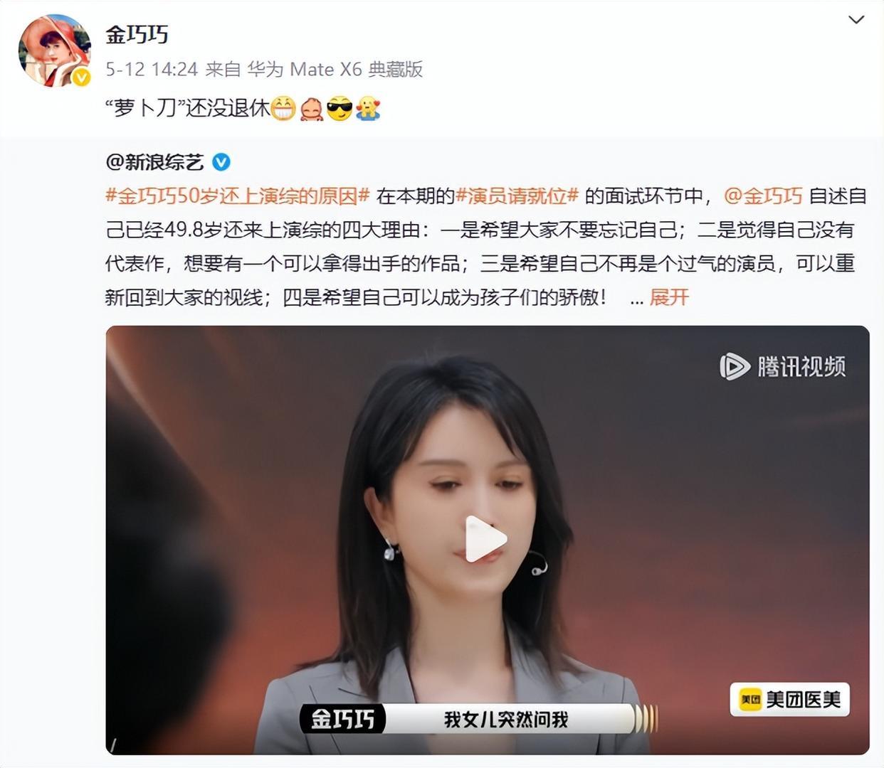 此前,@金巧巧 自述自己已经49.8岁还来上演综的四大理由:一是希望大家不要忘记自己;二是觉得自己没有代表作,想要有一个可以拿得出手的作品;三是希望自己不再是个过气的演员,可以重新回到大家的视线;四是希望自己可以成为孩子们的骄傲!希望姐姐可以保持积极的心态,在节目里让更多人看到演员金巧巧!