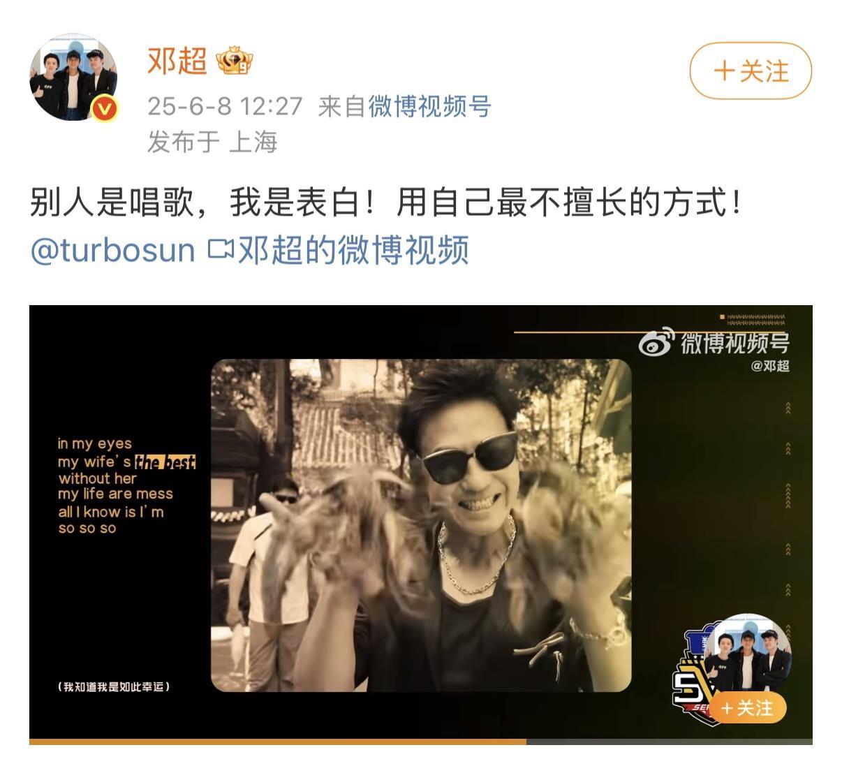 或许是为了证明自己的英文好得很,6月8日,邓超也在个人社交账号发布了一个视频,深情地念了一段英文朗诵向孙俪表白:“在我眼中,妻子是世间至宝,无她相伴,生活便乱作一团糟。我知道我是如此幸运,我承认,她是我‘永远的神’。”