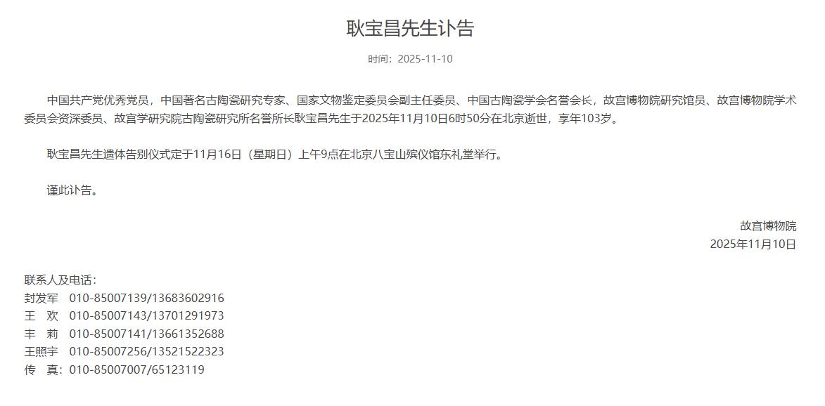 11月10日,故宫博物院发布耿宝昌先生讣告: