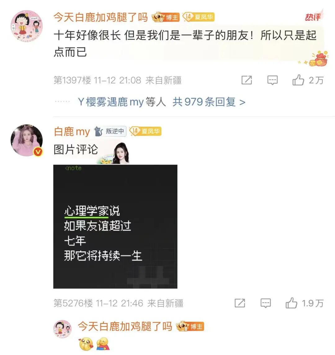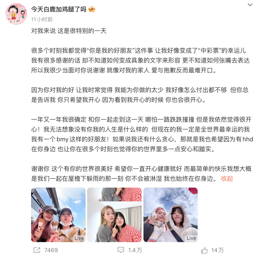随后呵呵发长文感谢白鹿,表示跟白鹿做好朋友如同中彩票一样,“我无法想象没有你我的人生是什么样的”。白鹿评论:“心理学家说如果友谊超过七年,那它将持续一生。”呜呜呜真好!