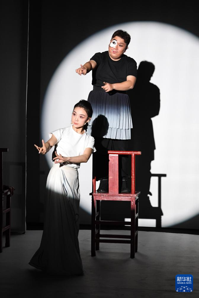 11月10日,演员晁花兰(前)和常江在北京繁星戏剧村表演《长相念》。