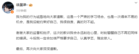 11月14日,徐晟津发文道歉:“我为我的行为诚恳地向大家道歉,这是一个严肃的学习场合,也是一次得来不易的机会,是我没能约束好自己,我很自责,真的对不起。谢谢大家的监督和批评,这次的教训我会永远刻在心里,时刻警醒自己不再犯同样的错误。今后我一定会加倍严格要求自己,认真学艺,踏实做人。最后,再次向大家深深道歉。 ”