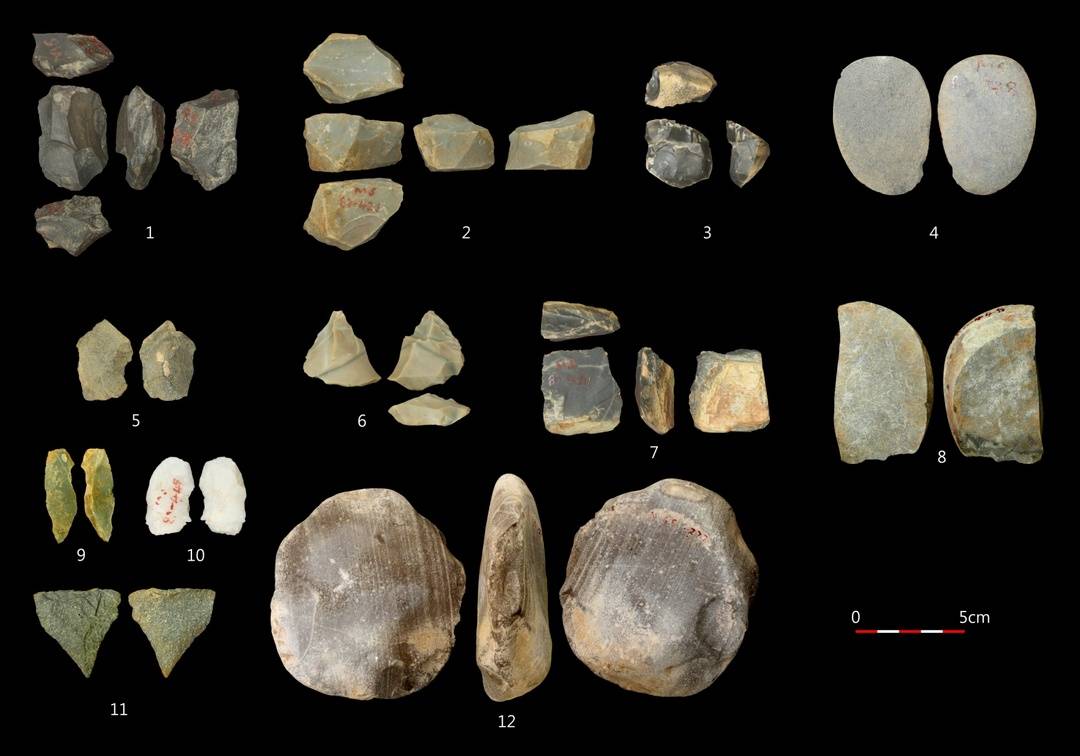 其中,下文化层原料以燧石、石英的结核或岩块为主,刮削器、砍砸器、凹缺器为其工具组合;上文化层原料以石英岩块为主,燧石、灰岩、玛瑙、玄武岩等均有较多使用,新出现有石锤、石砧、砍砸器、钻具等工具类型,且出现了骨针、骨锥等磨制精美的骨器。